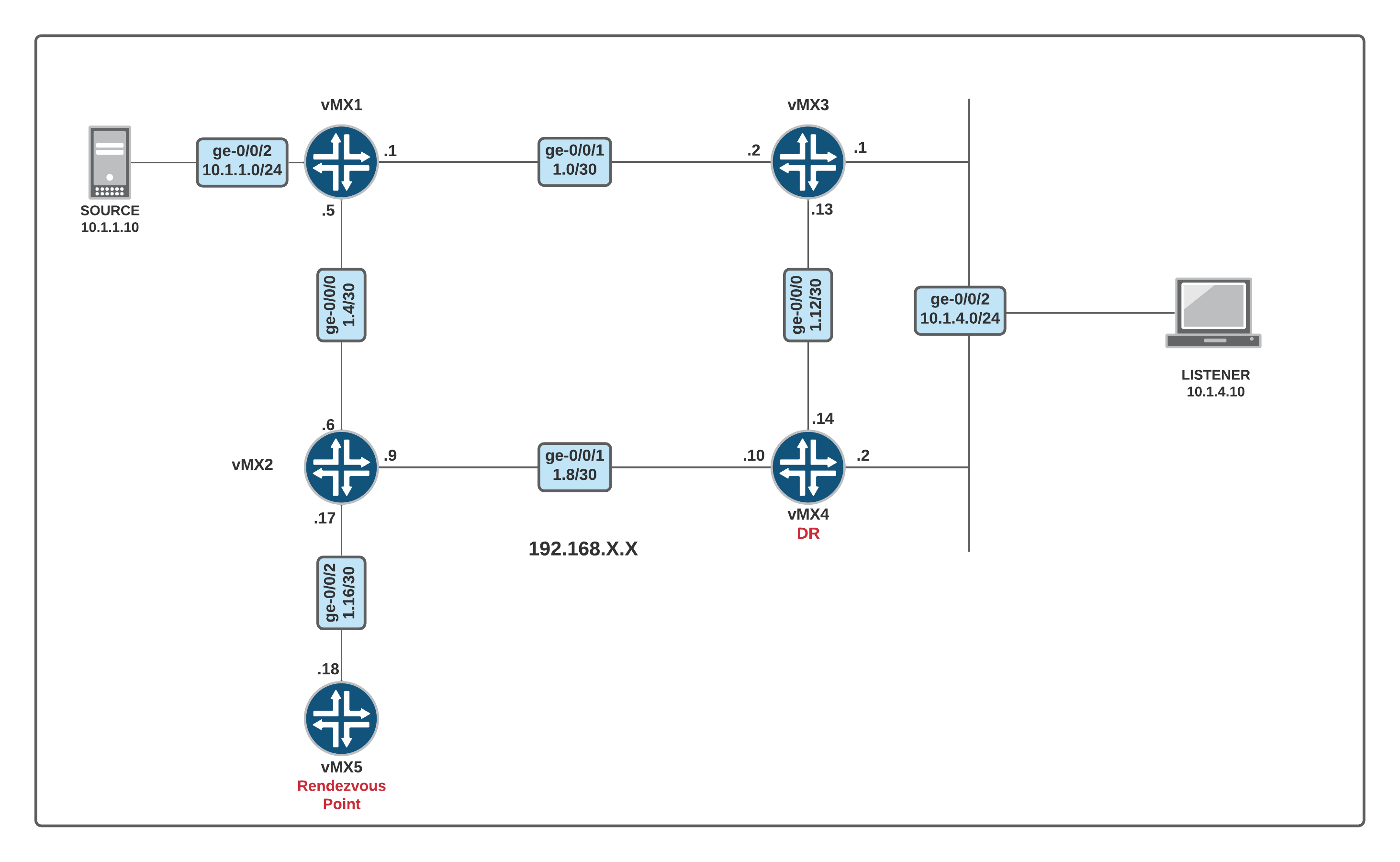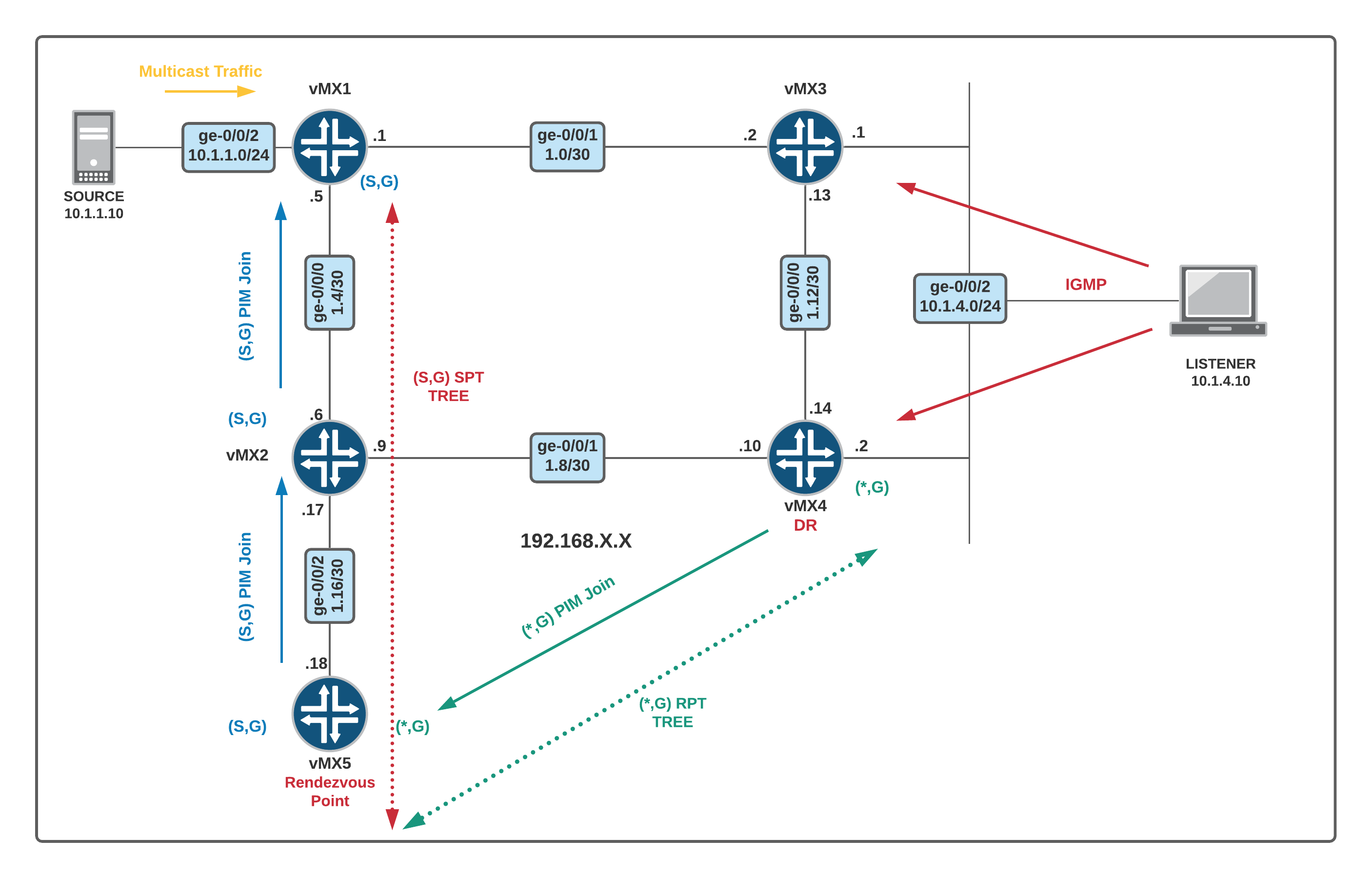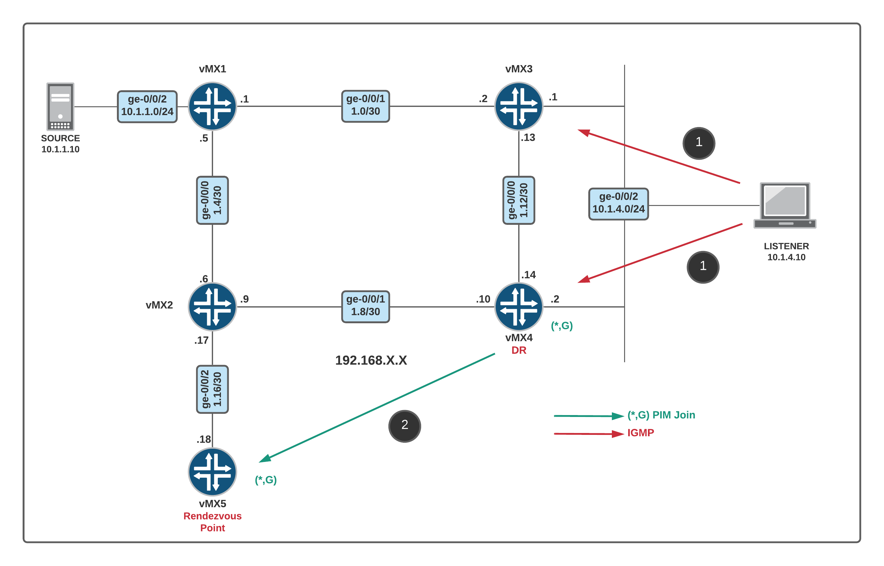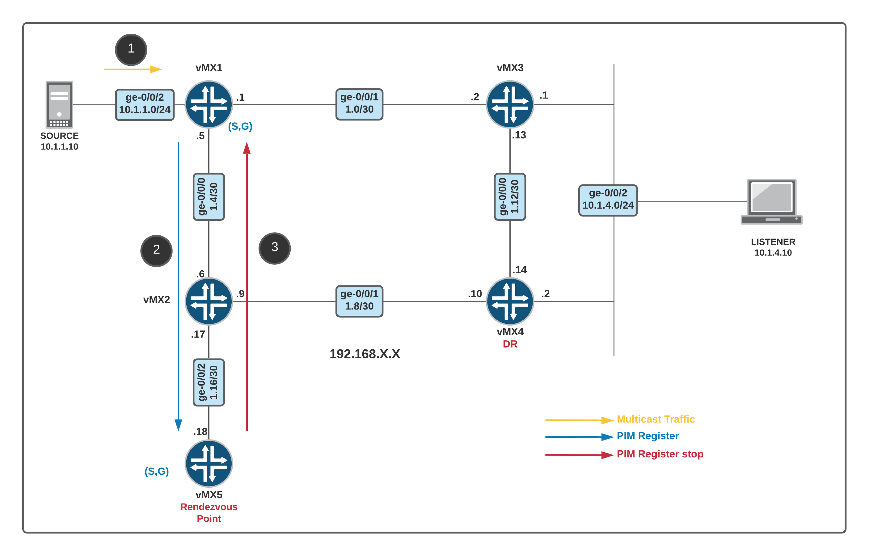 - RP sends (S,G) Join message towards the source hop-by-hop (vMX5 > vMX2 > vMX1) Basically it asks the FHR to send the RAW multicast packets.