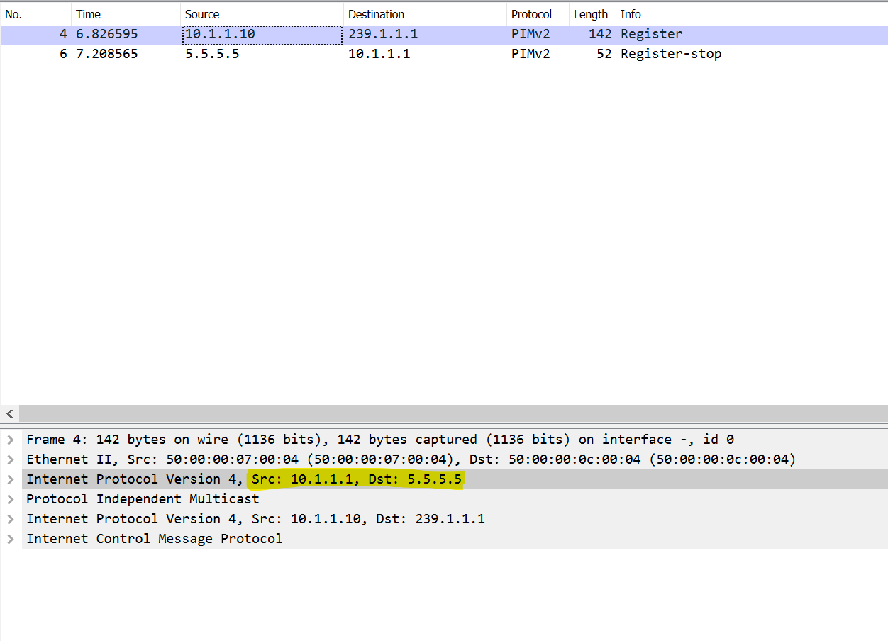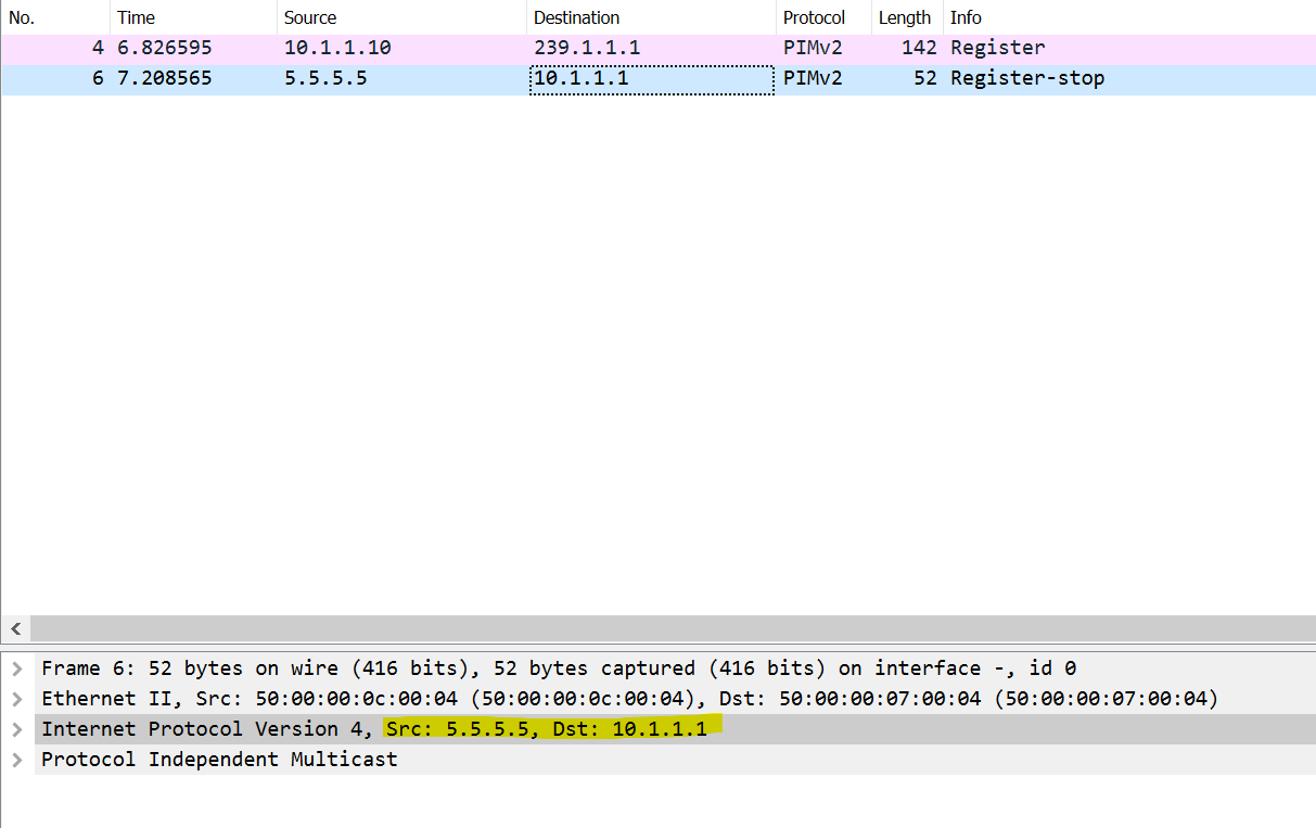 - Once the RP starts receiving the multicast packets natively over the (S,G) tree, it sends a Register-Stop message.