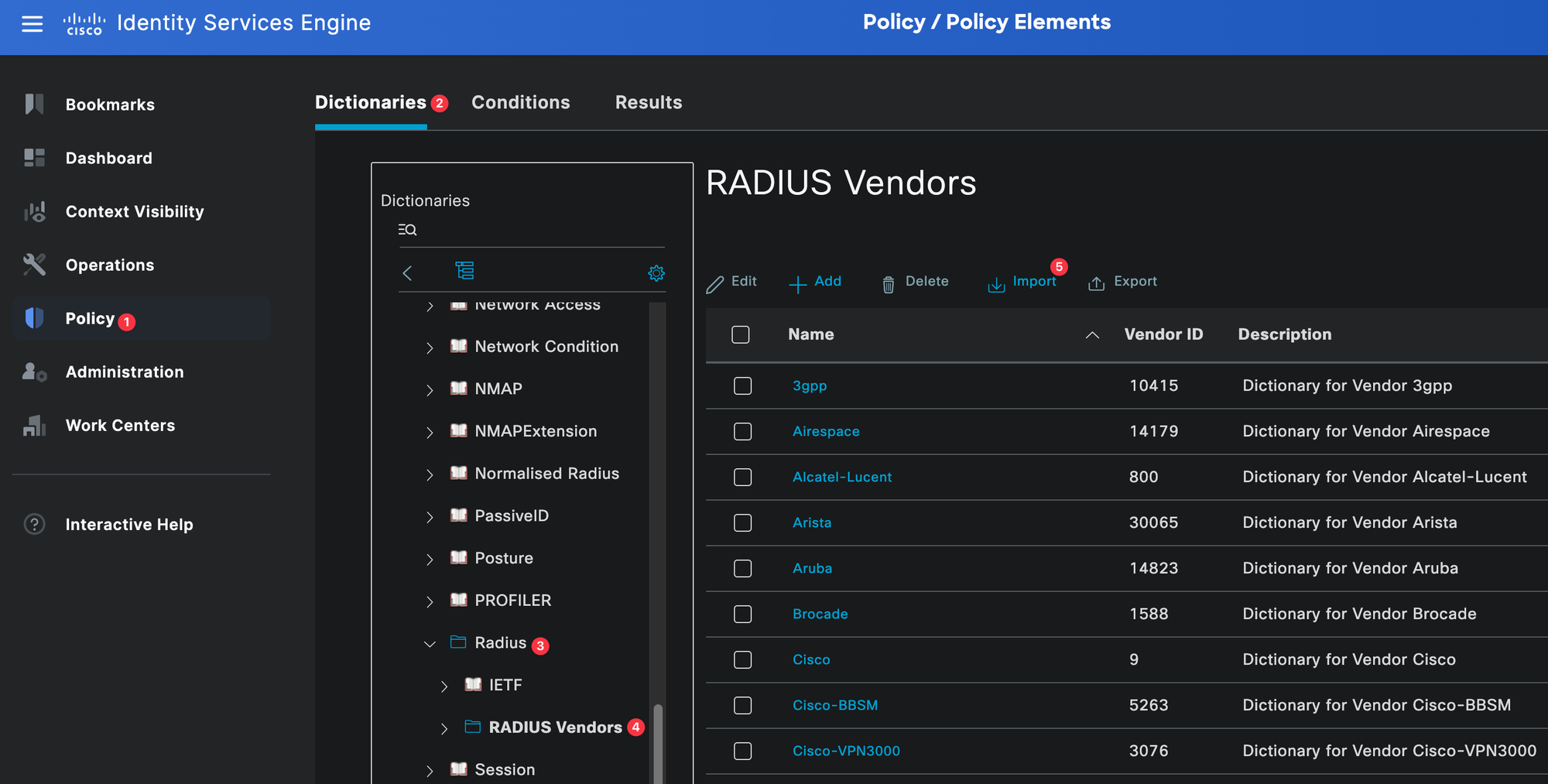END-VENDOR AristaSave this file as dictionary.arista and import it into Cisco ISE by navigating to Policy, Policy Elements and Dictionaries. Then, navigate to Radius, select Radius Vendors, and click the Import button.