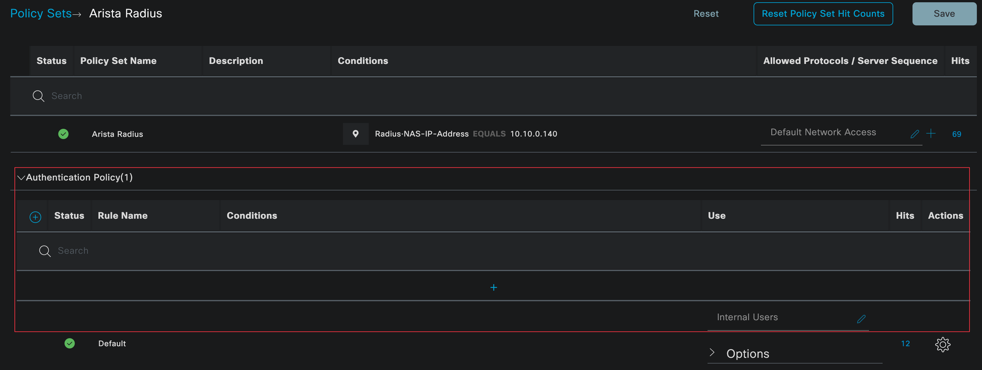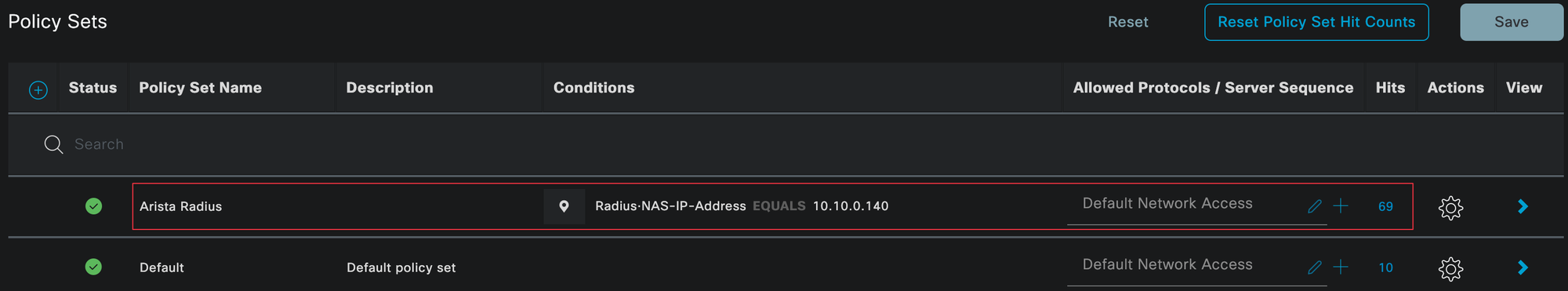 A policy set can be matched against many conditions, such as device vendor, device location, or protocol type. To keep things simple, we are matching the policy set based on the IP address of the Arista device using the Radius NAS IP address (this doesn't scale well on real environments, as you may have guessed 😄)