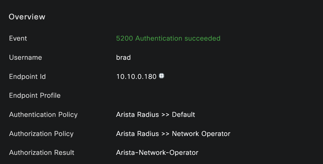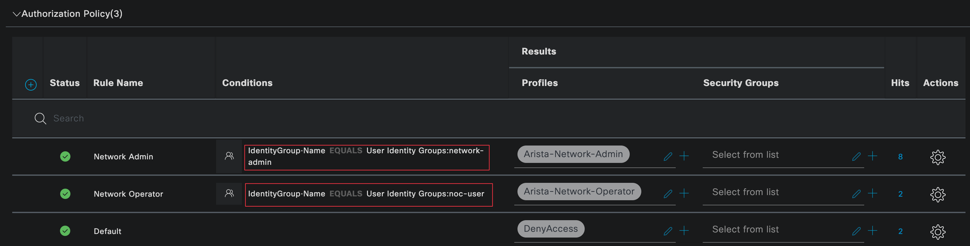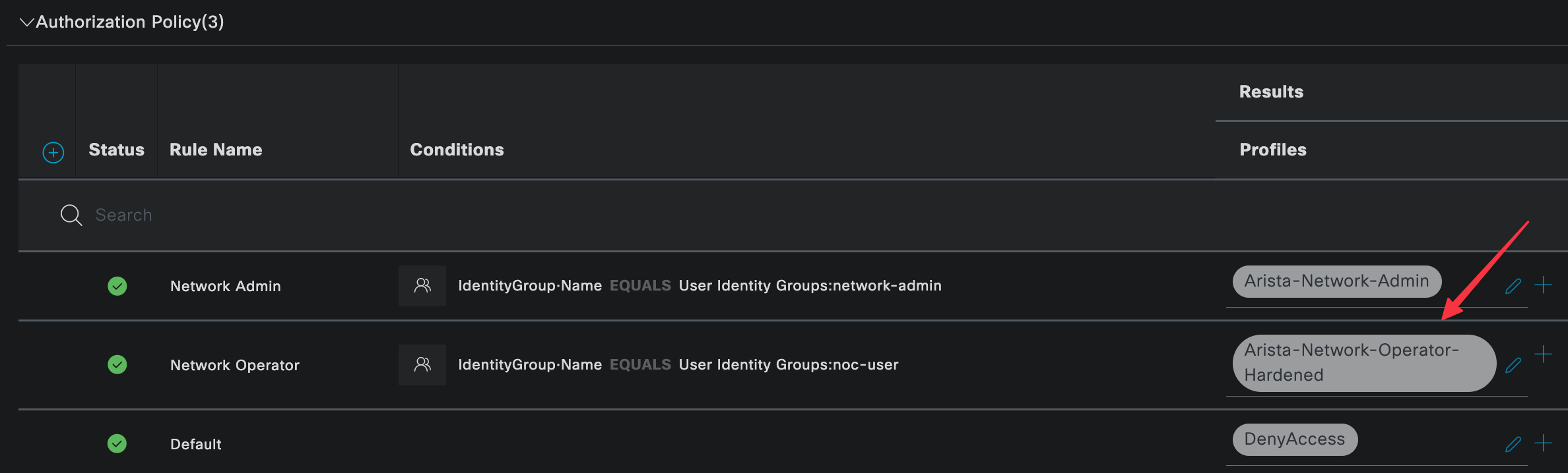 Once authentication is successful, the authorization policy is evaluated. This determines what level of access the user should receive. Here, we match users based on their identity group and return the appropriate authorization profile, which maps the user to either the Arista network-admin role or the network-operator role.