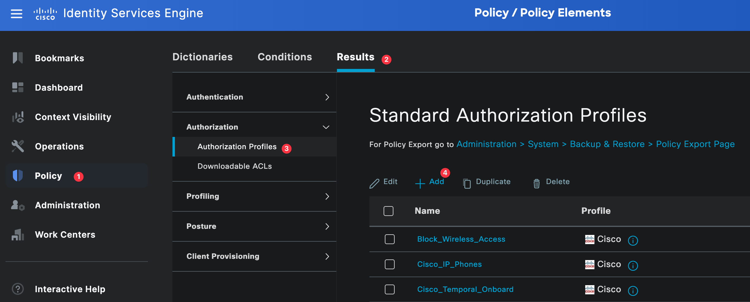 You can navigate to authorization profiles by going to Policy, Policy Elements, then Results, and selecting Authorization Profiles.