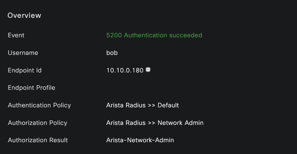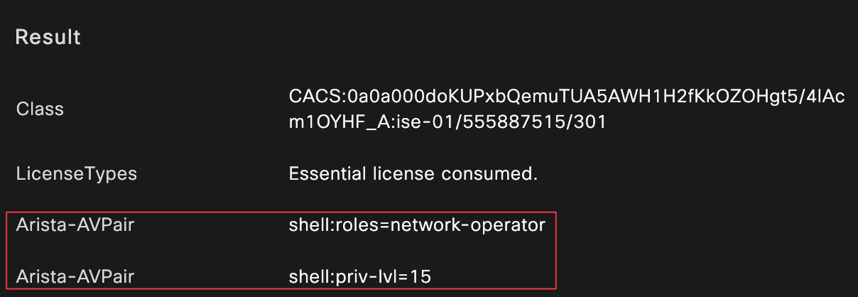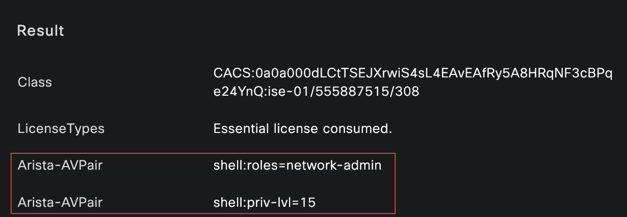 If the credentials are valid, ISE then looks at the user’s identity group and evaluates the authorization policy. Based on this, ISE responds with an Access-Accept message and includes vendor-specific attributes that tell the Arista device which role to apply to the user.