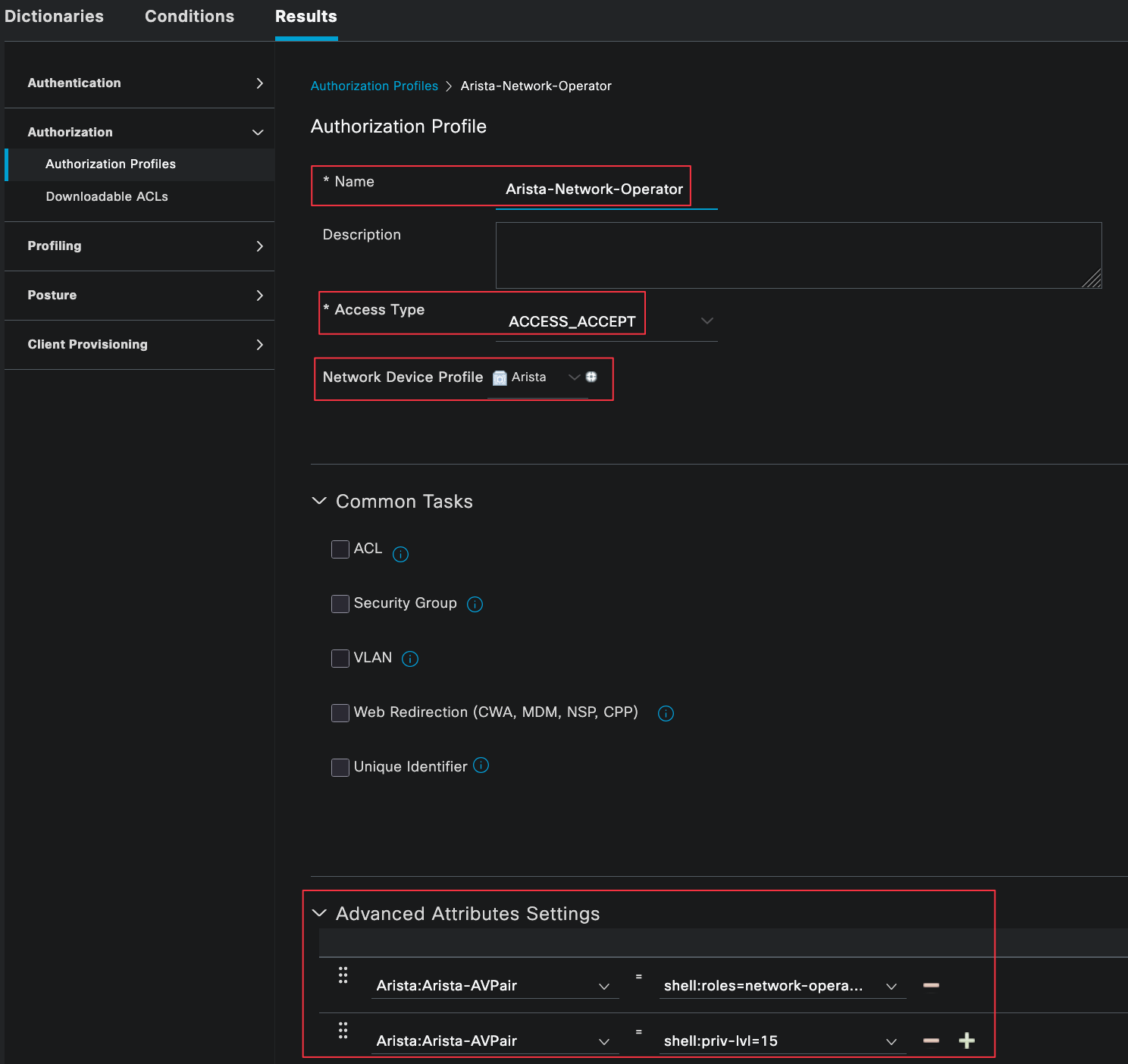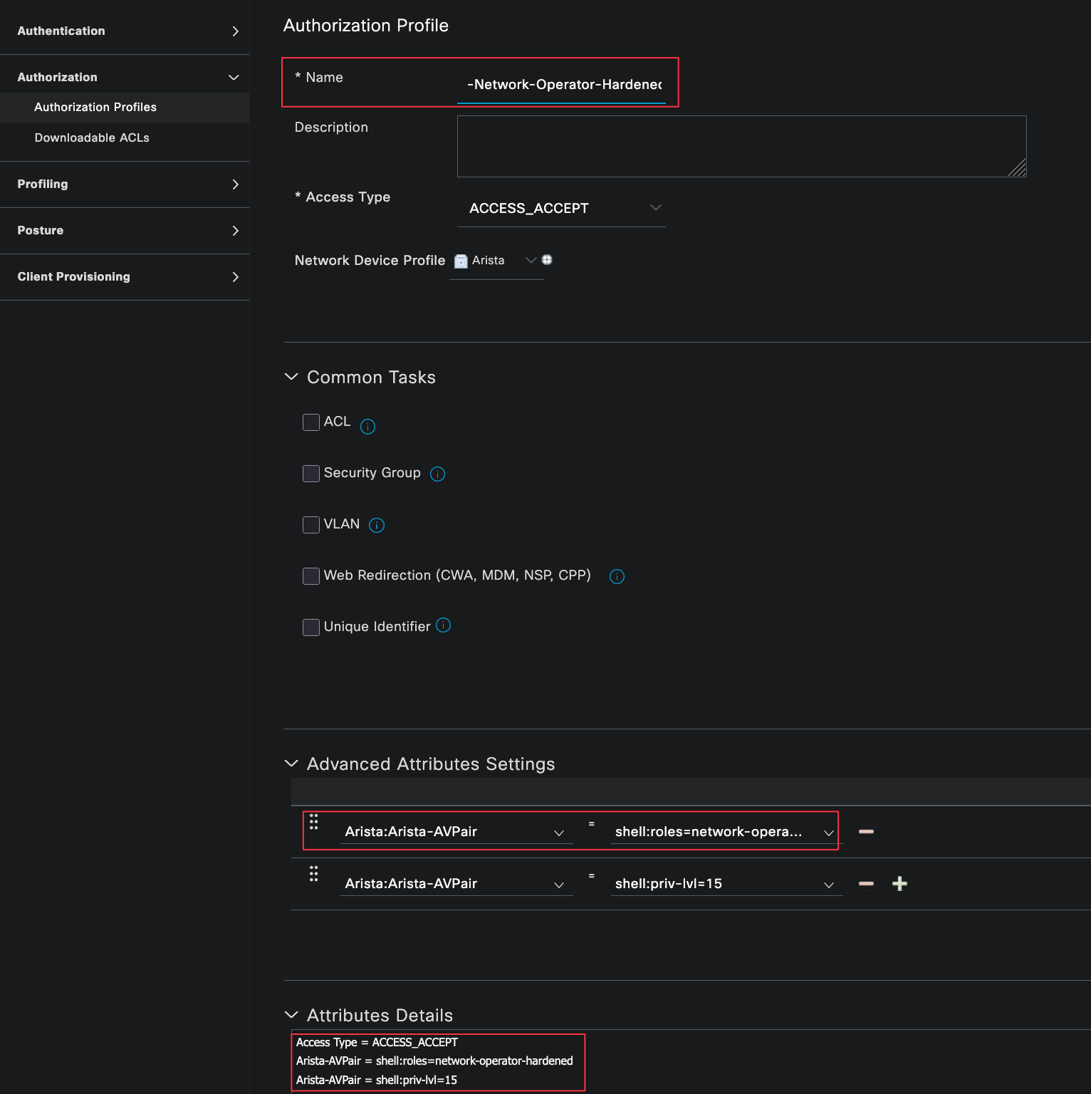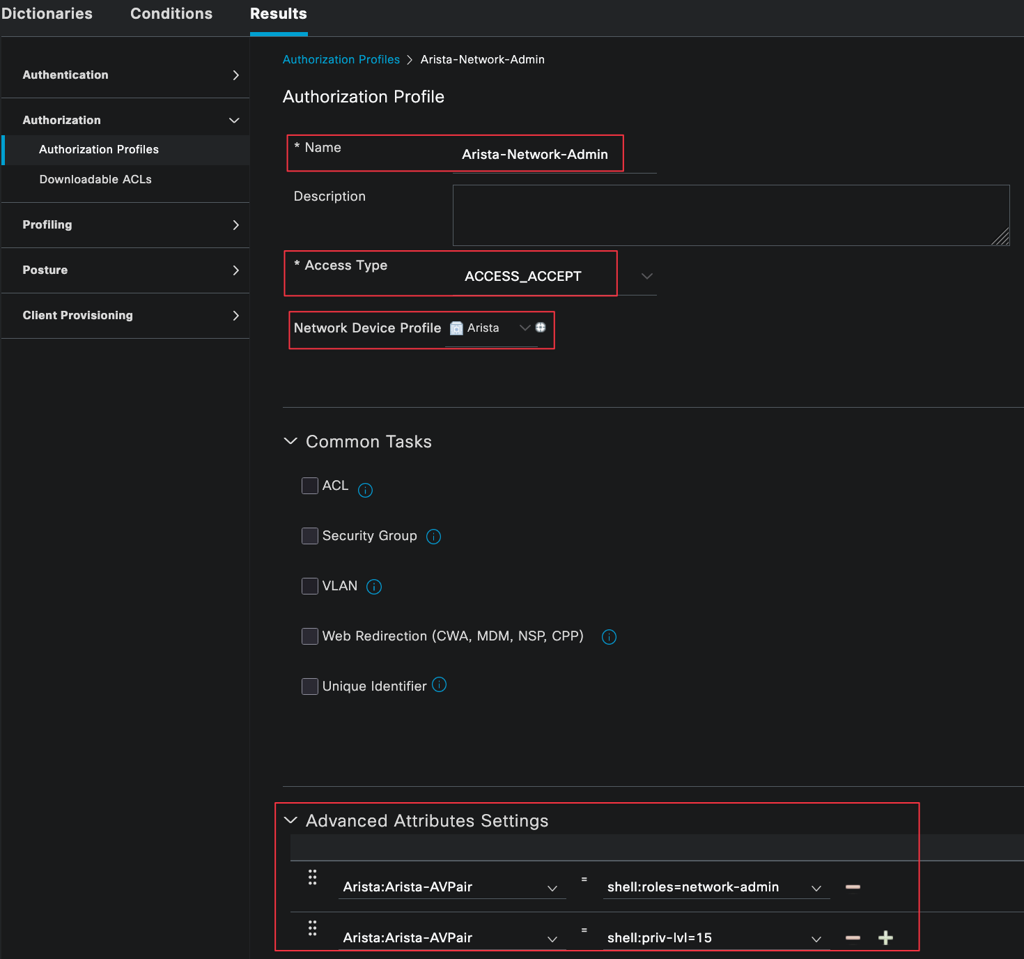 Authorization profiles define what access is granted to a user after they have been successfully authenticated. This is where we tell ISE which attributes to send back to the Arista device, such as the user role and privilege level.