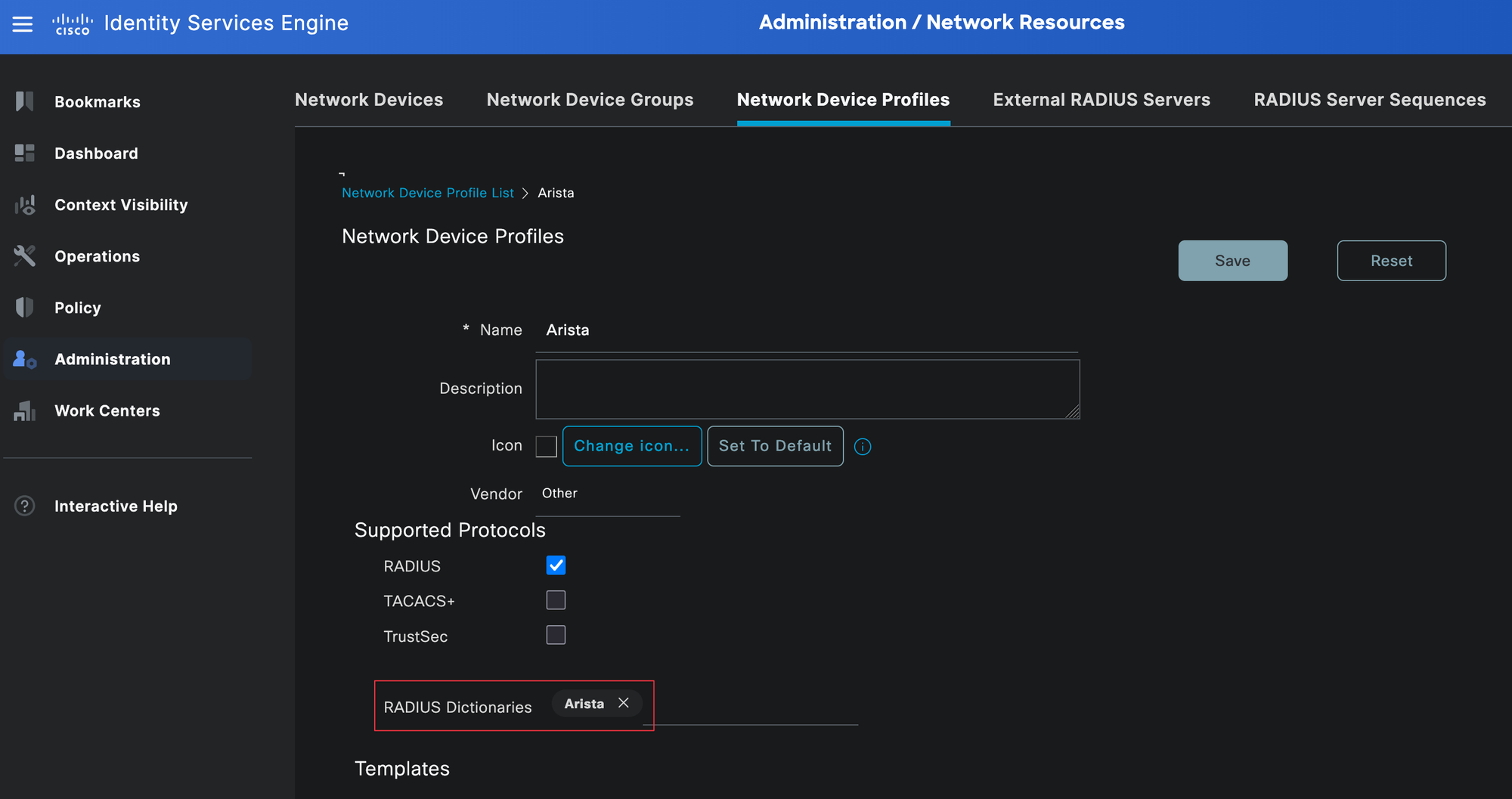 To create one, go to Administration, Network Resources, then Network Device Profiles. From here, you can either use an existing profile (if you have one already for Arista) or create a new one and assign the Arista Radius dictionary we created in the previous step.