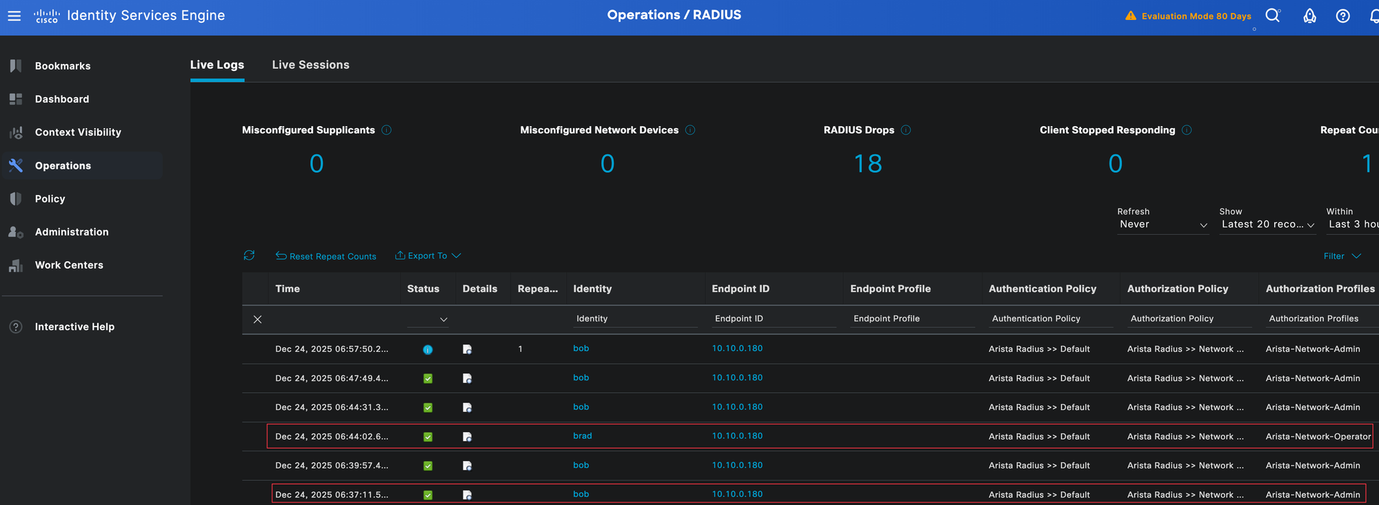 I logged in as both bob and brad, and you can clearly see that each user matched the correct authentication and authorization policies, along with the expected authorization profile.