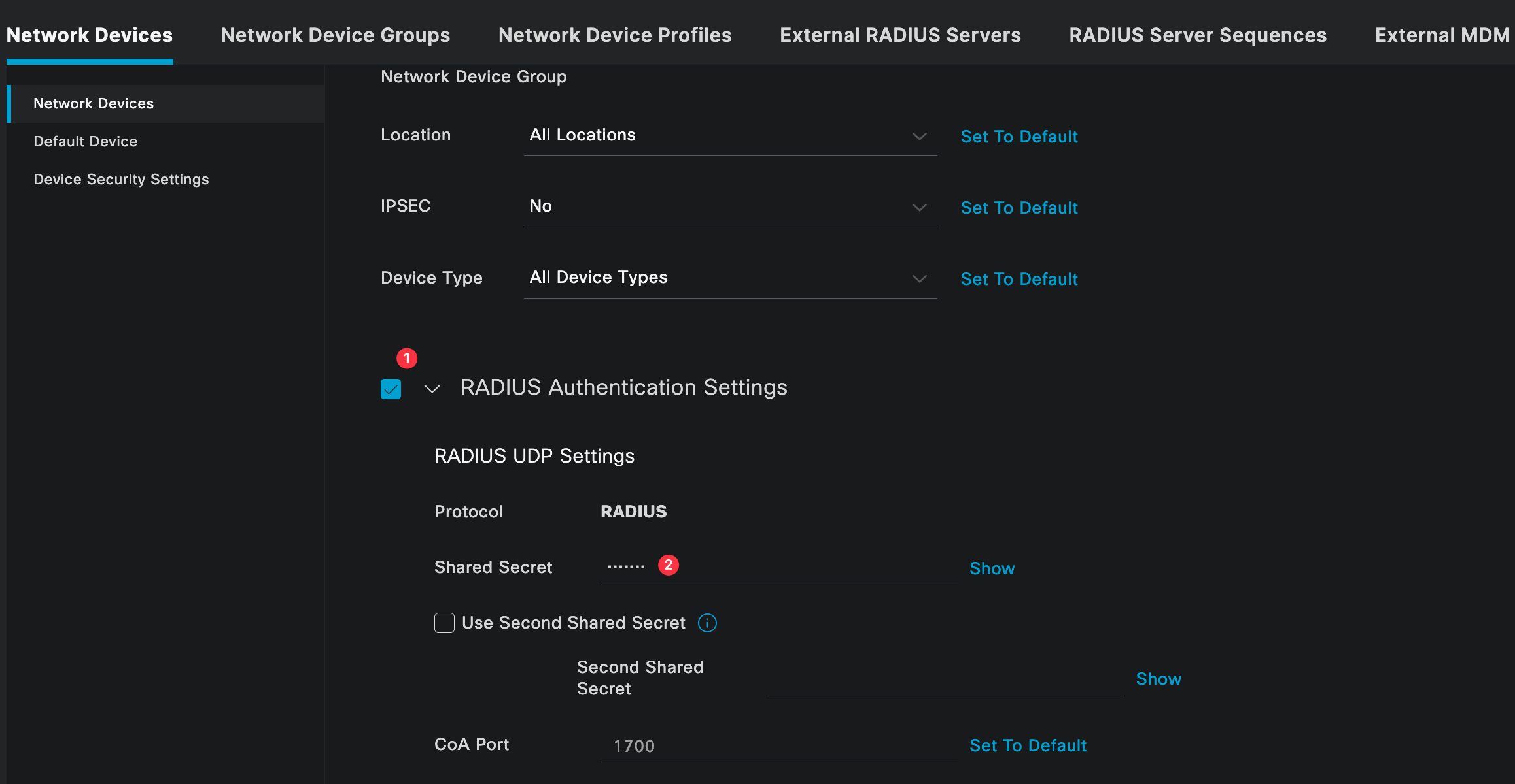Next, add the Arista device to Cisco ISE. This tells ISE which device will be sending Radius requests.
