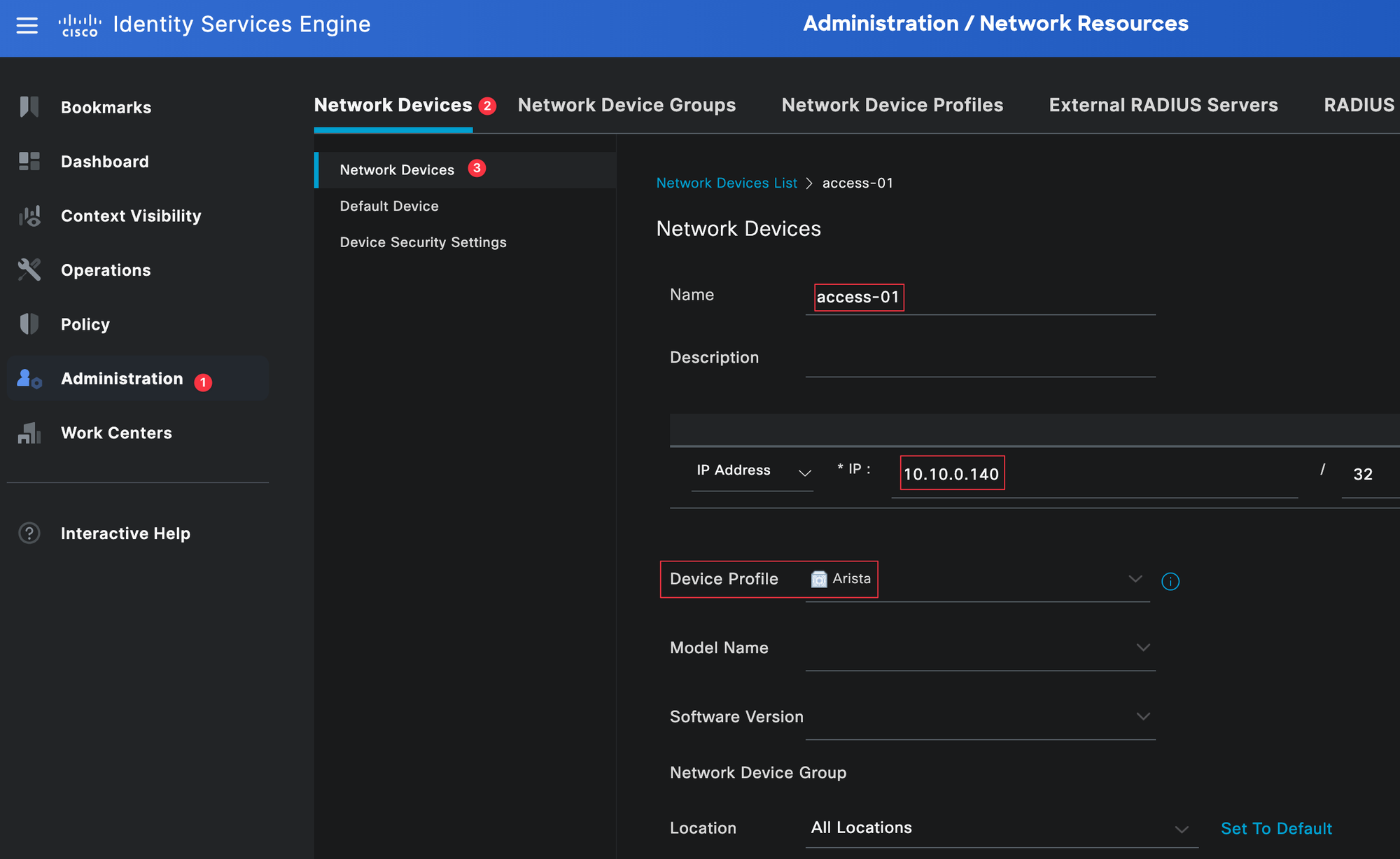 Navigate to Administration, Network Resources, then Network Devices and create a new device. Specify the hostname and IP address of the Arista switch, then associate it with the device profile we created earlier. You can leave most of the other fields set to their default values.