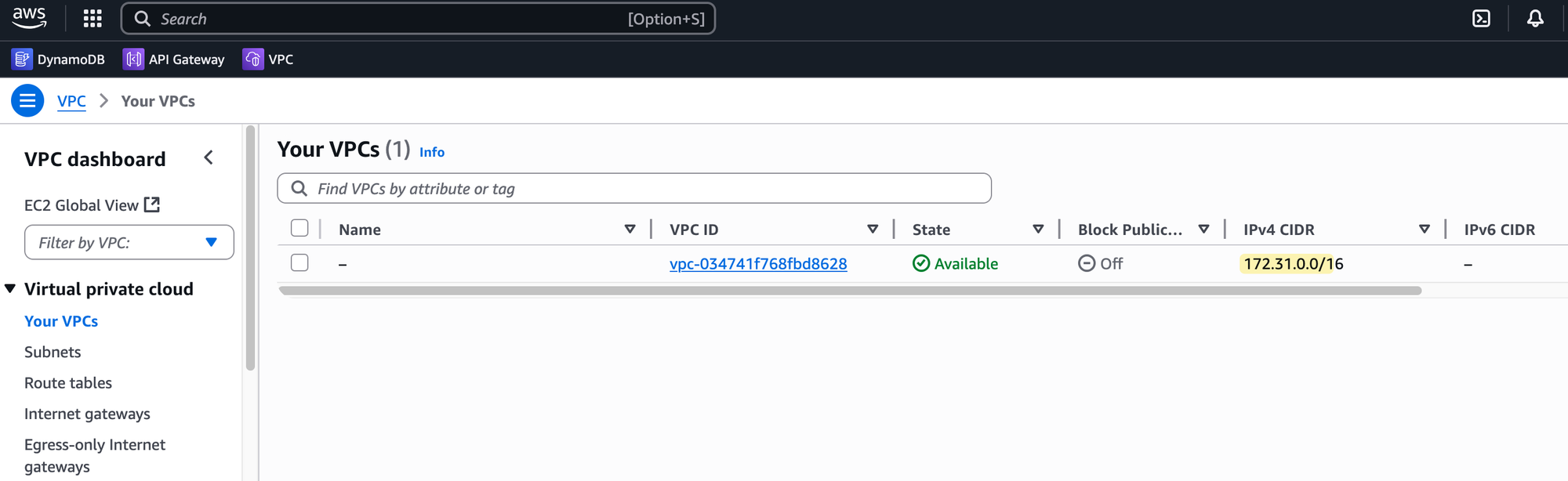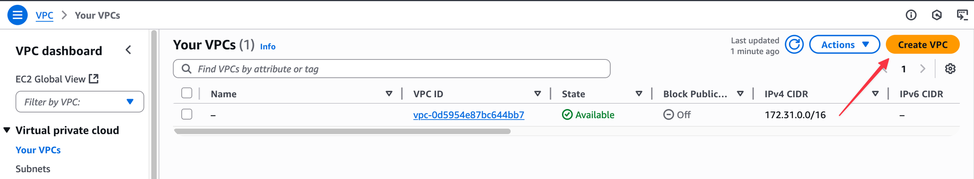 In each AWS Region, a default VPC is automatically created for you with the CIDR block 172.31.0.0/16. I would highly recommend not using it for anything other than quick, temporary tests. It is much better to create a new VPC from scratch, even for your own labs. Building your own VPC is the best way to understand how all the different networking components work together.