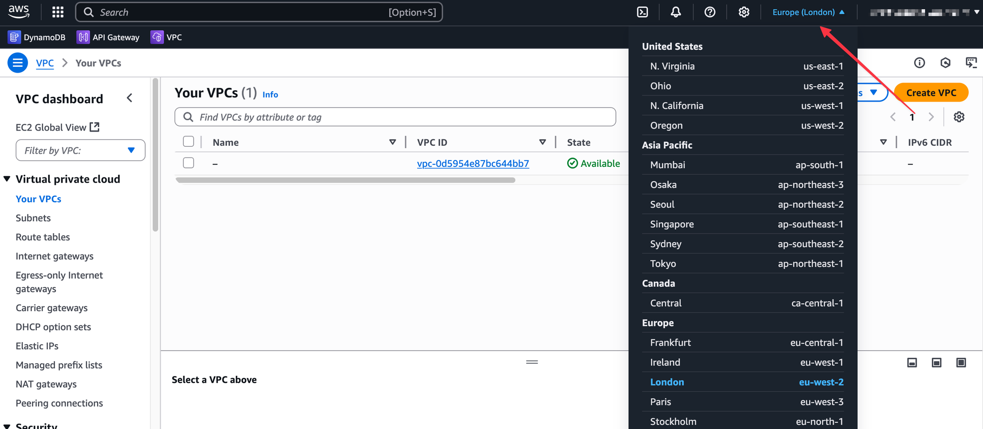 We are going to create a new VPC with the CIDR 10.200.0.0/16. First, you need to choose your working Region. When you first log into the AWS Management Console, you can see and select your desired Region from the top right corner of the page. Everything we do from this point on will be deployed inside the Region we select here.
