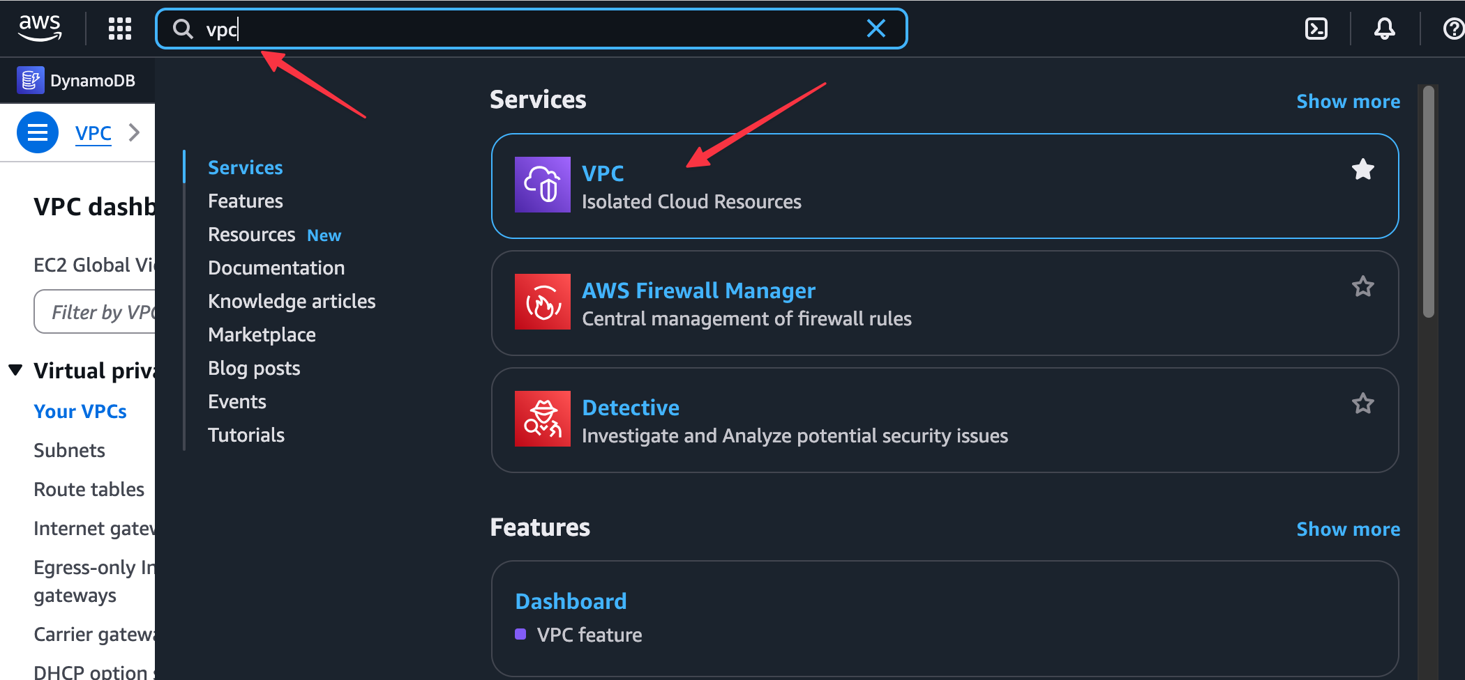 Once you are in your chosen Region, you'll see that AWS offers hundreds of different services. VPC is one of them. In the main search bar, search for VPC to navigate to the VPC service console.