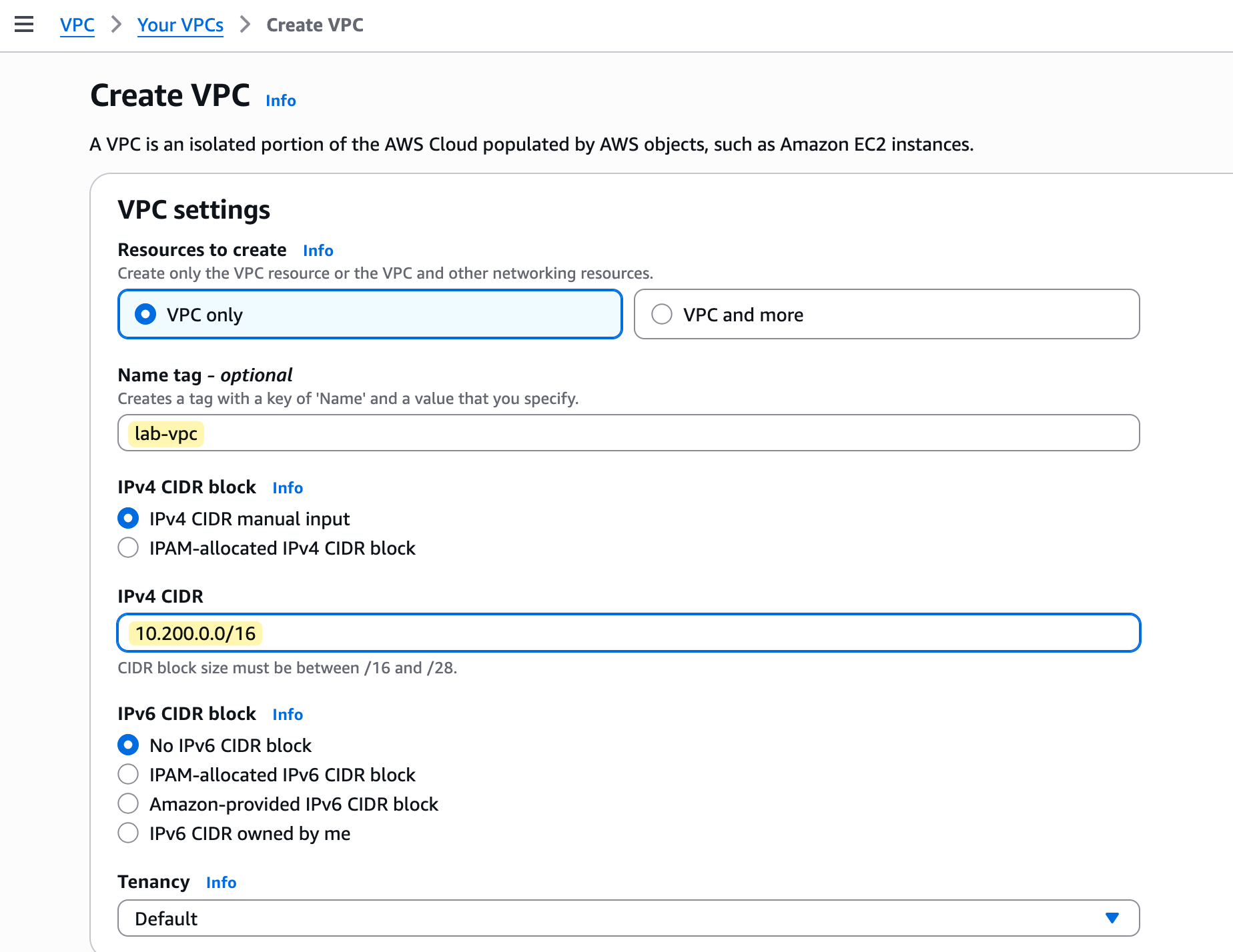From there, you can create a new VPC. For our lab, go ahead and create a VPC, give it the name lab-vpc, and assign it the CIDR block 10.200.0.0/16.