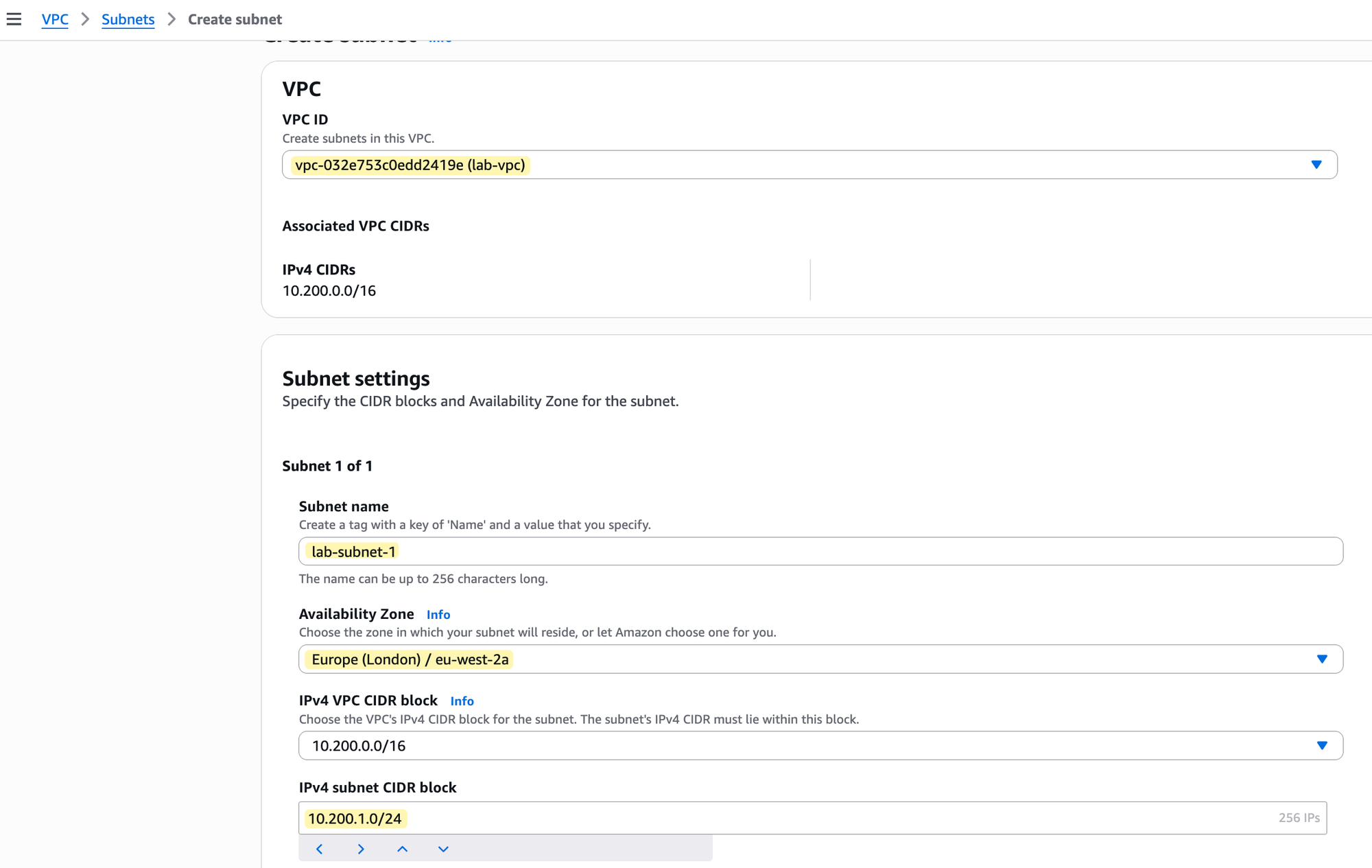 First, you must select the VPC where this subnet will live; in our case, this is the lab-vpc. The console will show you that its CIDR block is 10.200.0.0/16. Next, you need to give your subnet a name, like lab-subnet-1, and choose a specific Availability Zone to place it in, such as eu-west-2a. Finally, you must assign the subnet its own IPv4 CIDR block that is a part of the VPC's larger range. As shown in the image, we will use 10.200.1.0/24 for this subnet.