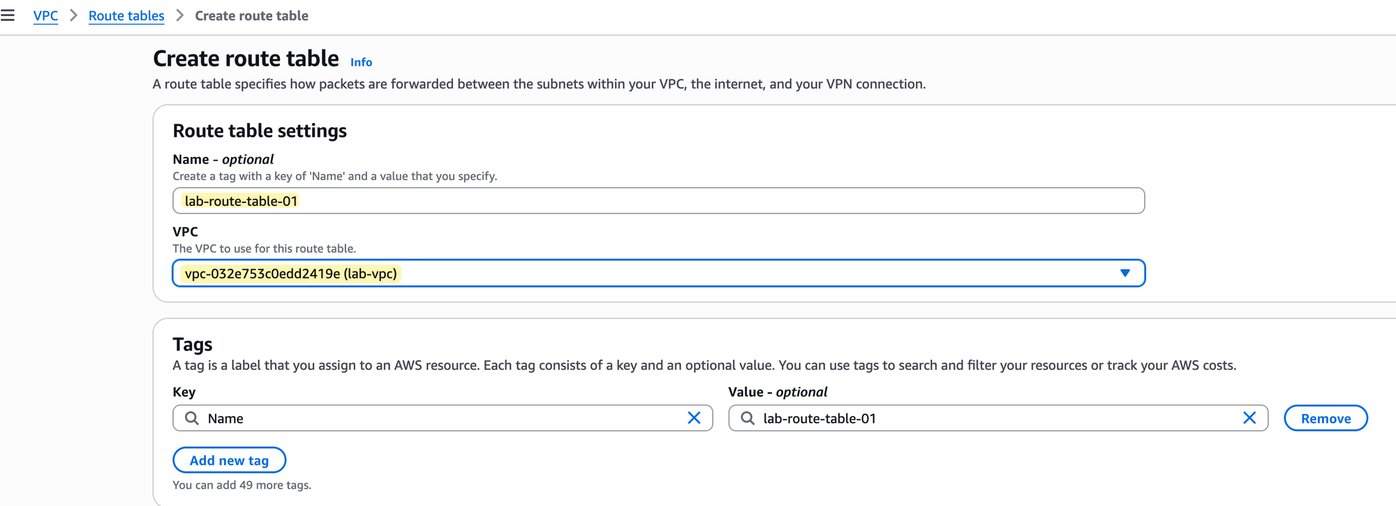 Go to the Route Tables section of the VPC console and choose to create a new one. As shown in the image, you just need to provide a name, such as lab-route-table-01, and select the VPC it belongs to, which is our lab-vpc.