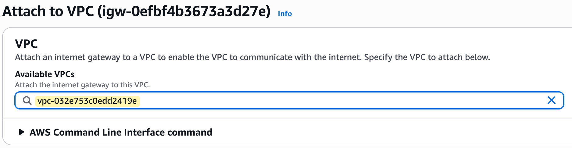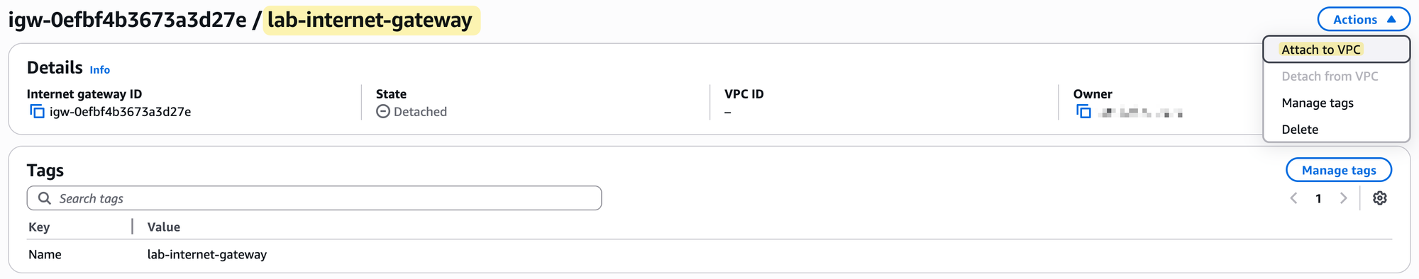 After creation, you must perform a second step, which is to explicitly attach it to your VPC. In our case, we will attach it to our lab-vpc.
