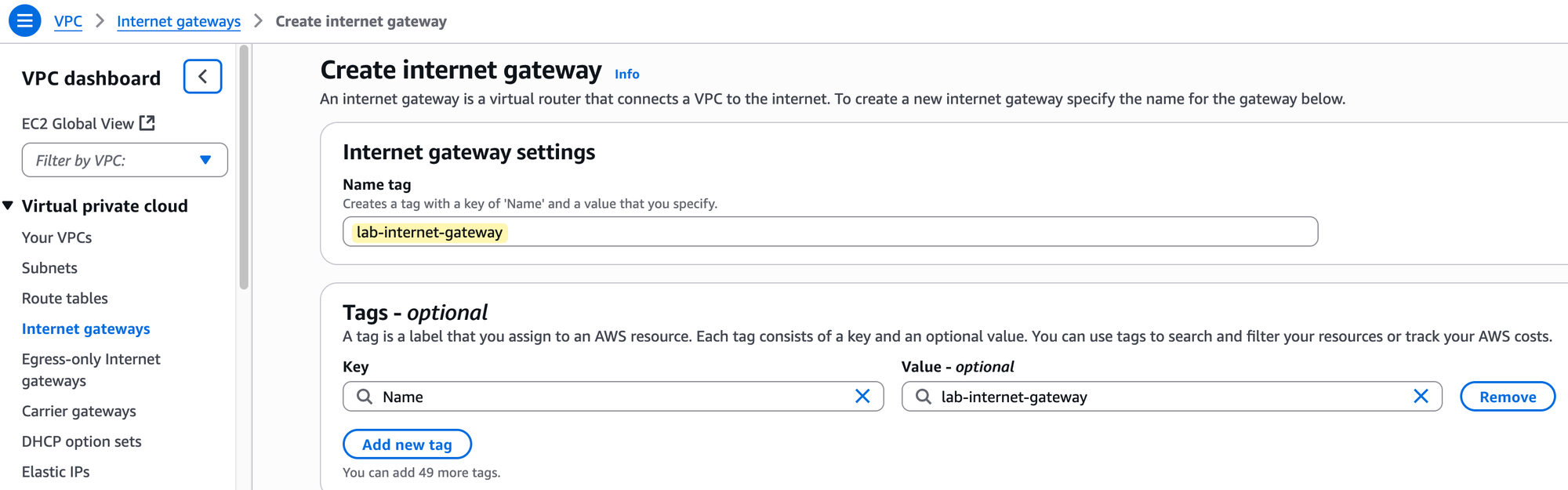 To set this up, we will first create an Internet Gateway and give it a name, for example, lab-internet-gateway. Creating the IGW is not enough; by itself, it is not associated with any network.