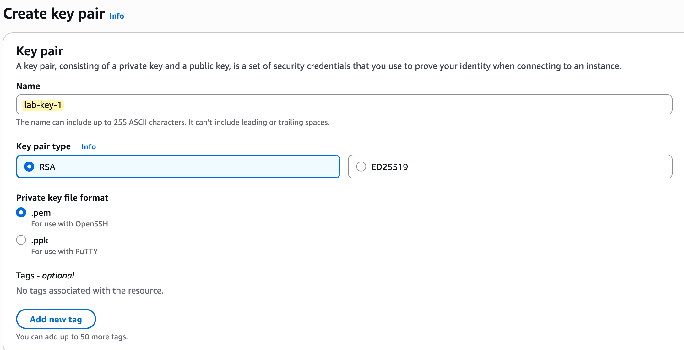 For this example, I am accepting all the default options - RSA for the type and .pem for the file format. I will give it the name lab-key-1.