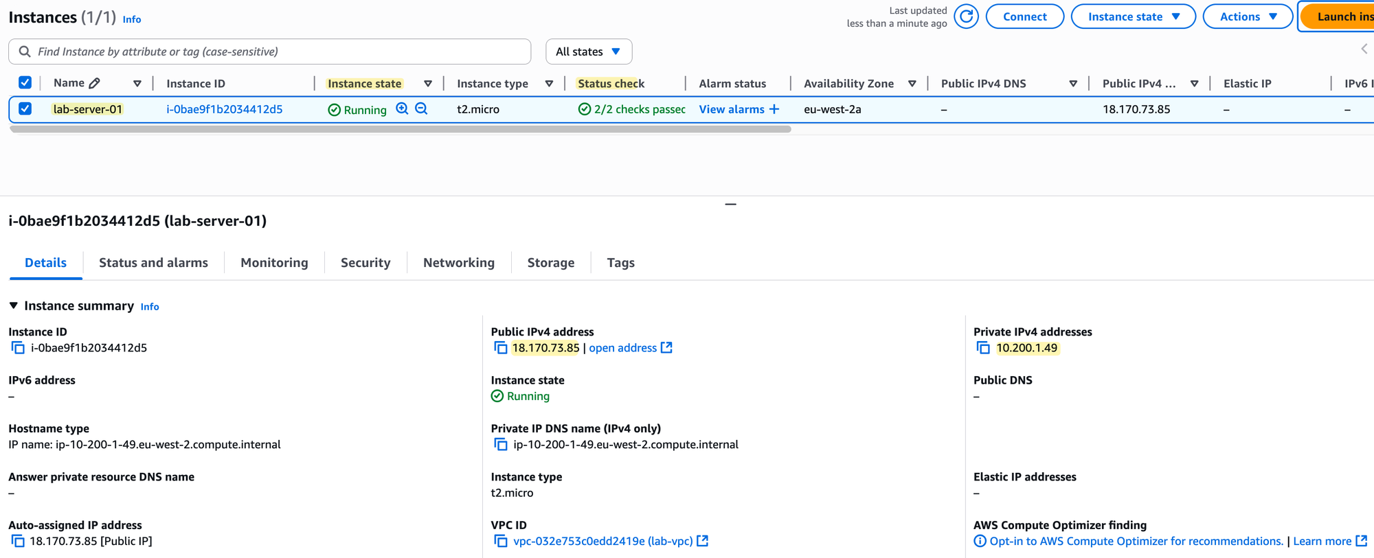 If you click on your instance ID, the details pane will open. You will see that the instance has a Private IPv4 address from our subnet's range (10.200.1.49) and also the Public IPv4 address that was assigned to it. Since we already allowed our home IP address in the security group, we should be able to connect to it now using SSH.