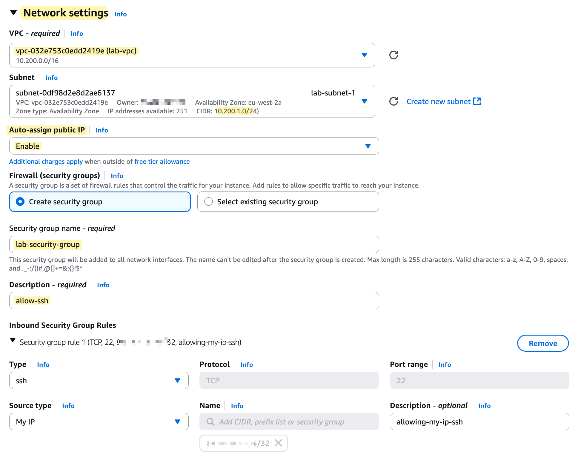 Finally, we need to configure a Security Group. Think of this as a mini-firewall that is attached to the EC2 instance and controls its inbound and outbound traffic. For this section, we will create a new security group and add one inbound rule that allows SSH traffic (on port 22) but only from your current public IP address (masked in the screenshot 😄)