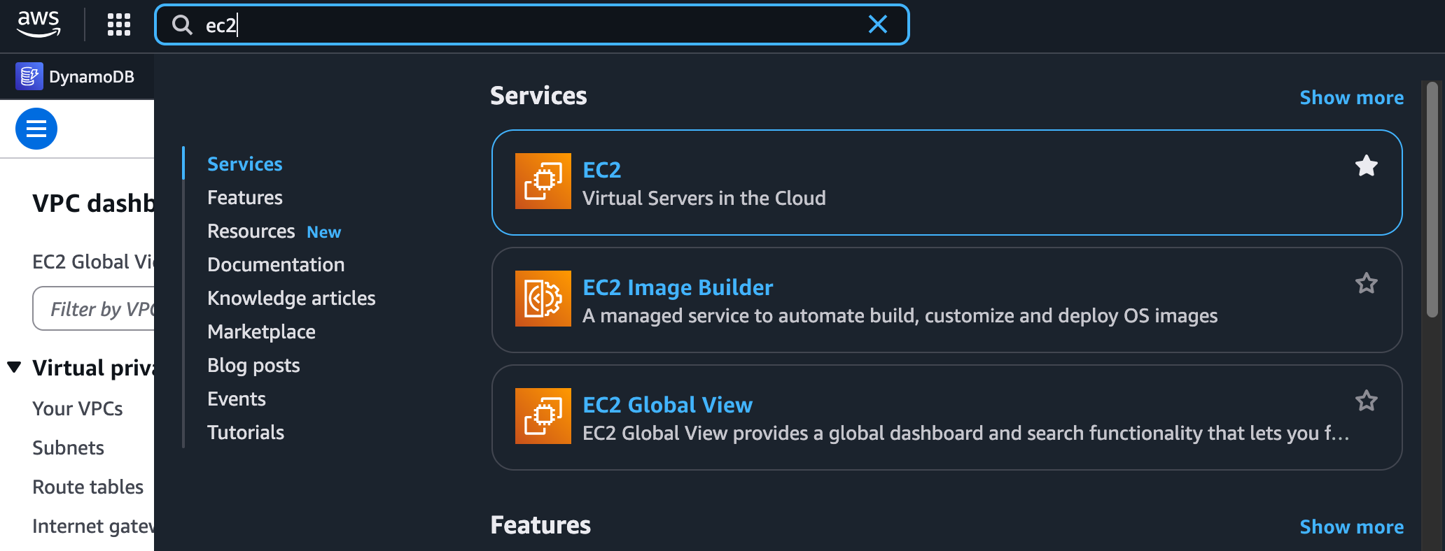In the top search bar, simply type EC2 and select the service to go to its dashboard. Navigating between different service consoles is a normal part of working in AWS, and you will get used to it quickly as you use the platform more.