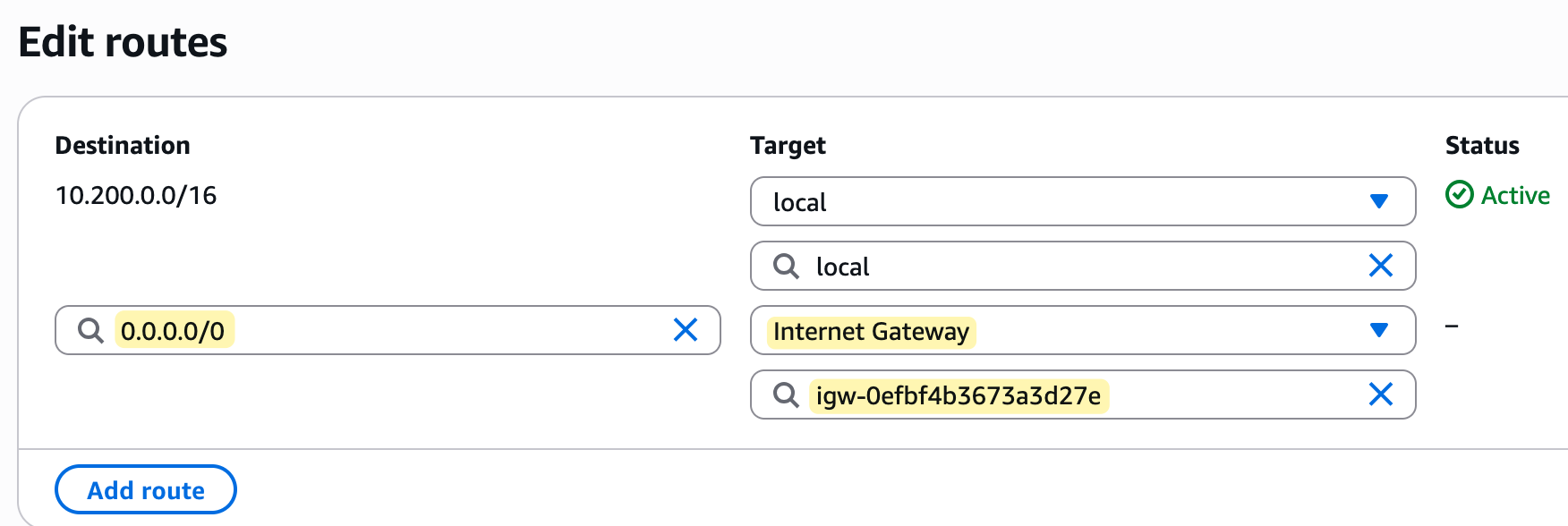 It shows the VPC's CIDR block (10.200.0.0/16) as the destination and has local as the target. This route is automatically added by AWS to every route table in a VPC and it cannot be deleted. Its purpose is to allow all resources within the VPC to communicate with each other using their private IP addresses.