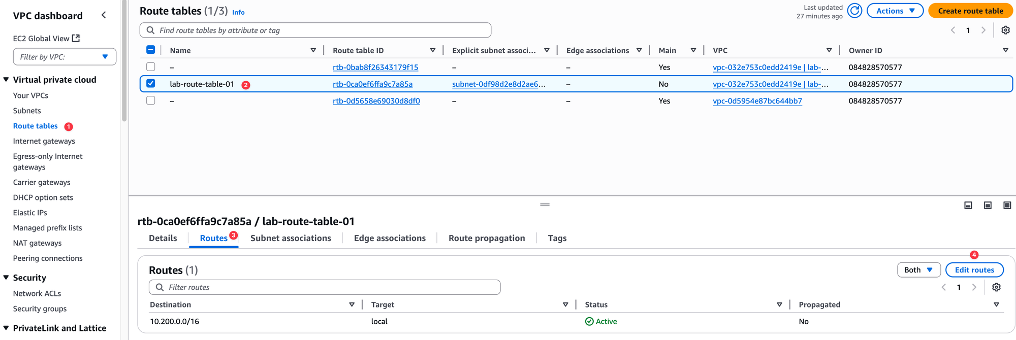 It is best practice to leave the main route table in its default state and create custom route tables for your subnets. This gives you more granular control over routing, which is why we created lab-route-table-01.