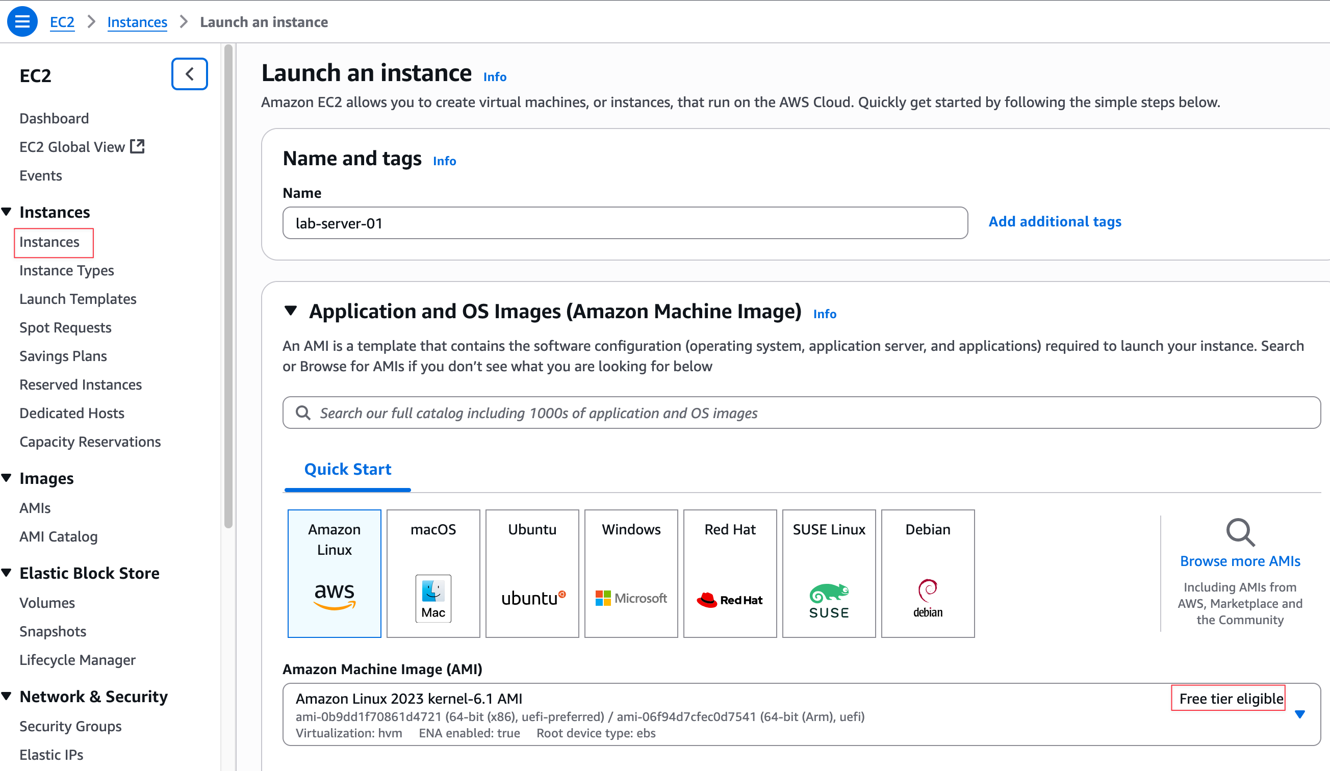 First, give your instance a Name, such as lab-server-01. In the Application and OS Images (Amazon Machine Image) section, you can select the operating system for your server. An Amazon Machine Image (AMI) is a template that contains the software configuration (operating system, application server, and applications) required to launch your instance.