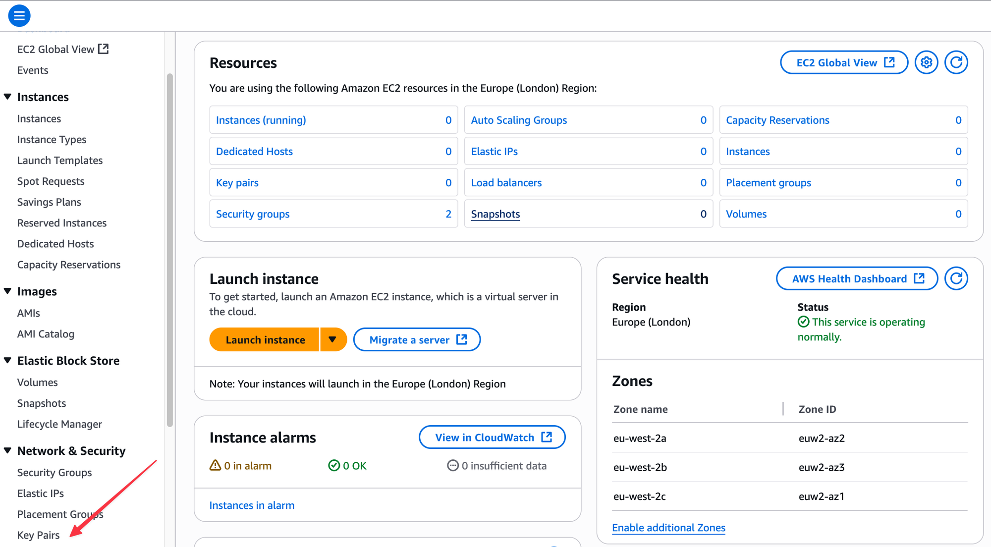 Once you are in the EC2 console, look for Key Pairs in the navigation menu on the left, under the 'Network & Security' section. From there, choose to create a new key pair.