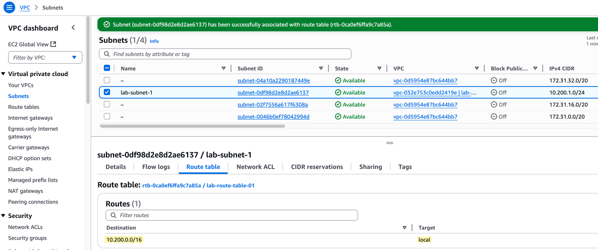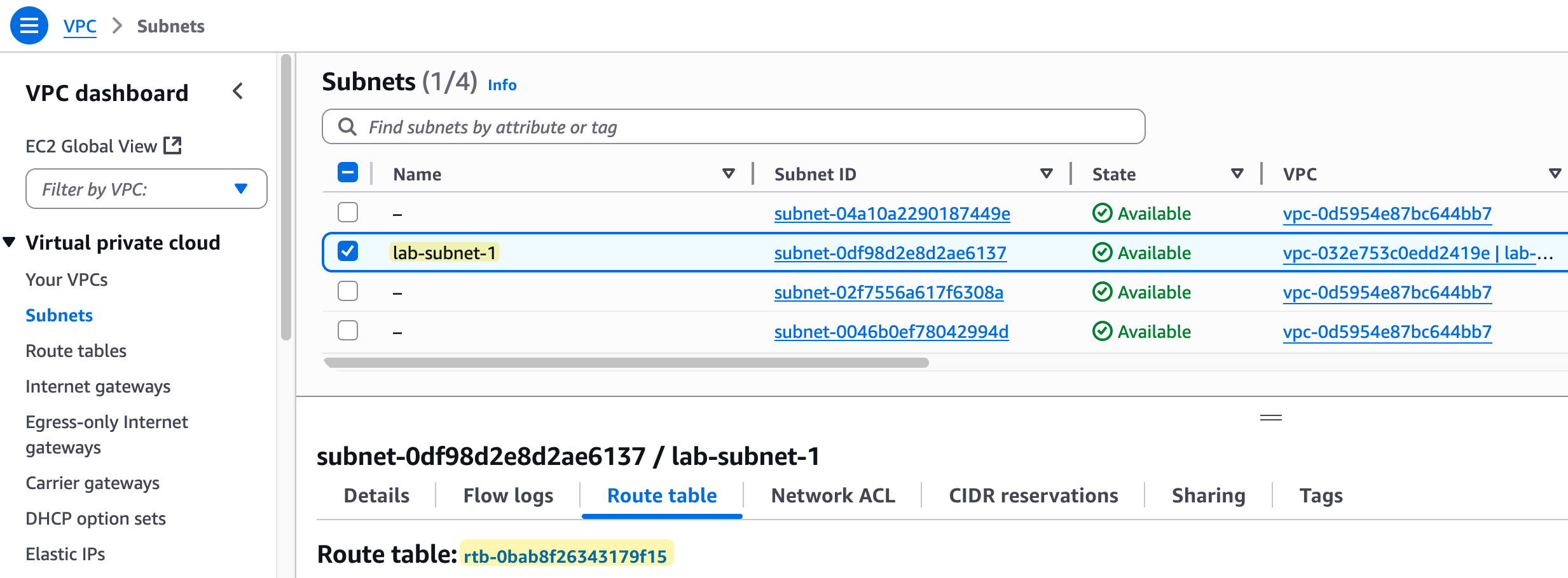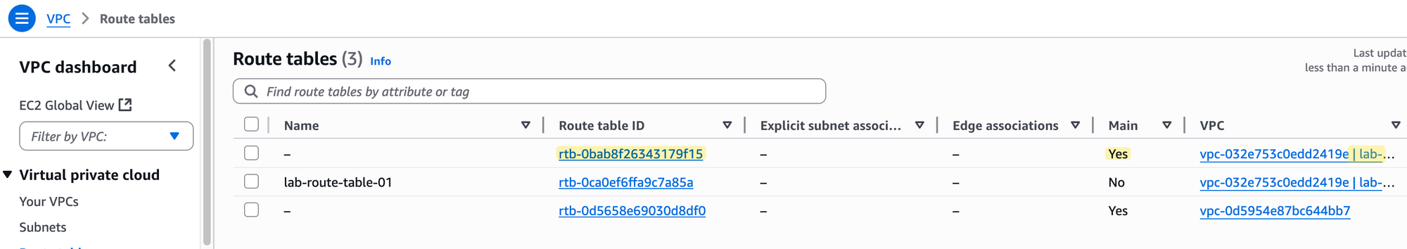 This means that right now, our lab-subnet-1 is associated with the main route table of our lab-vpc.