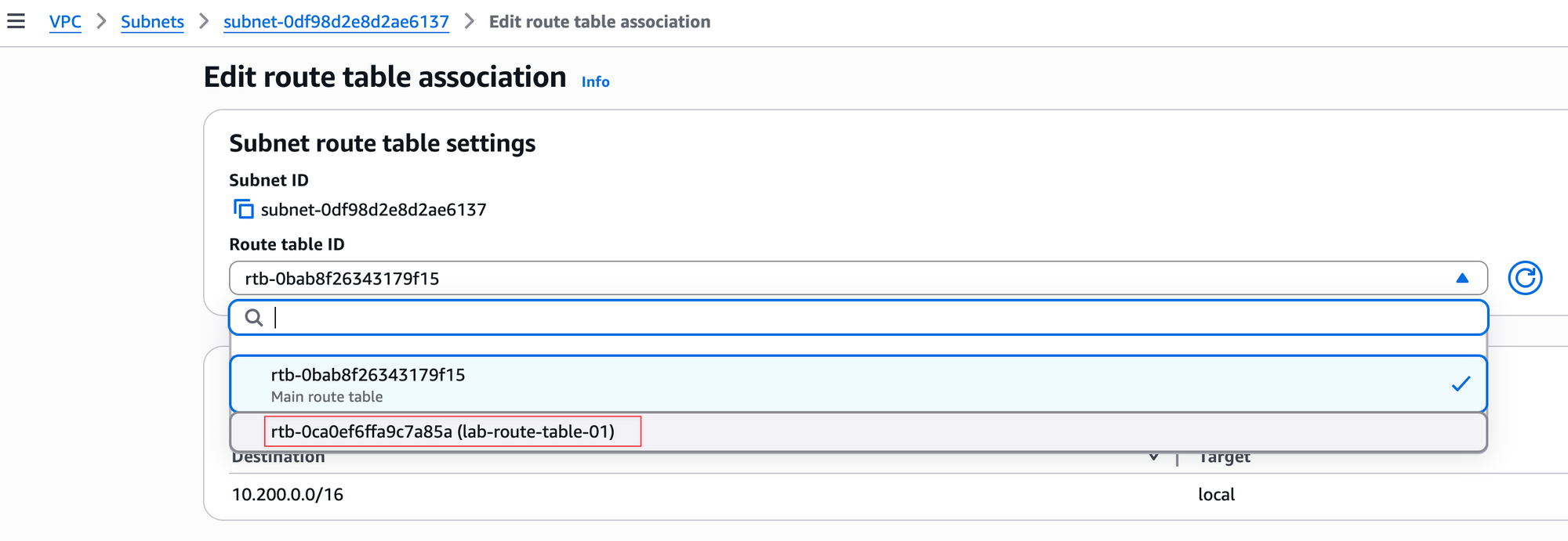 The next step is to associate our custom route table (lab-route-table-01) with our subnet (lab-subnet-1). By default, the subnet is using the main route table, so we need to change that. You can do this by editing the subnet's route table association and selecting the custom route table we created, as shown in the image. Once you save this change, lab-subnet-1 will use the rules in lab-route-table-01 to direct its traffic.