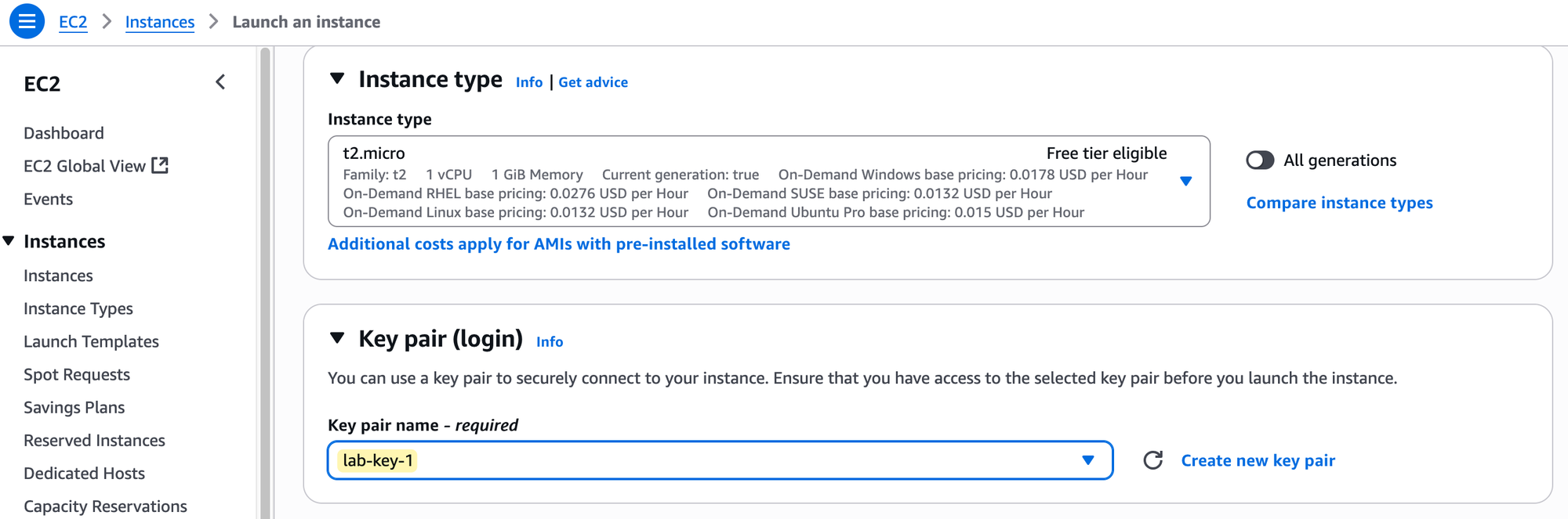 In the Key pair (login) section, select the lab-key-1 key pair that we created in the previous step. This is how we will securely log in to the server.