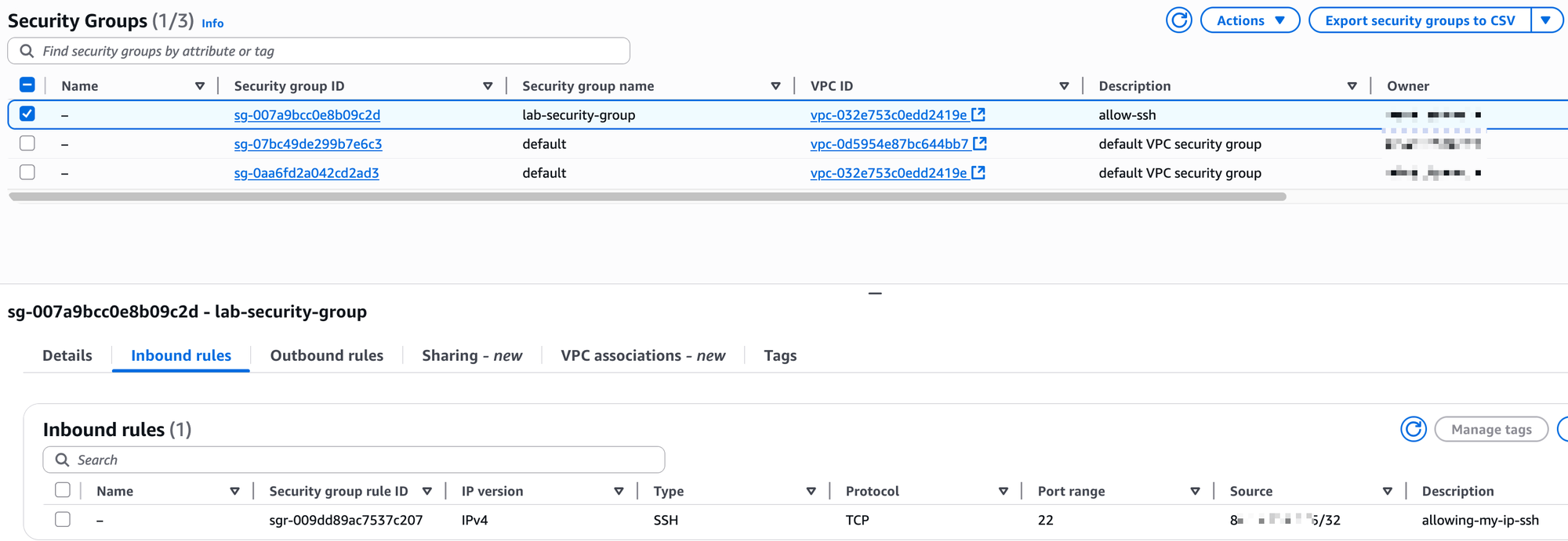 When we created our instance, we created a security group named lab-security-group and added an inbound rule to allow SSH (port 22) from our specific IP address. This is why we were able to connect to it.