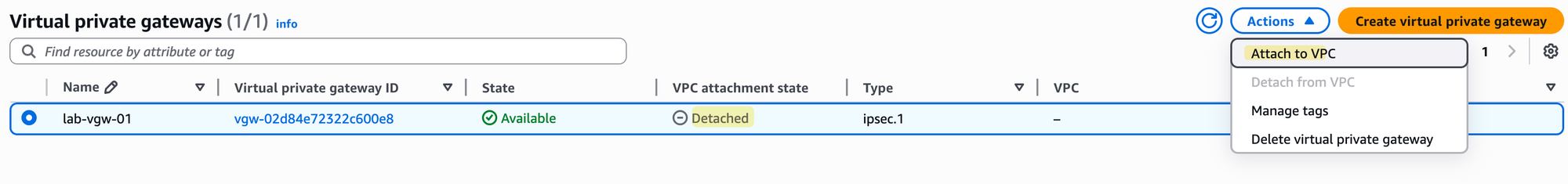 When a VGW is first created, it exists as a standalone resource, and its state will show as 'detached'.