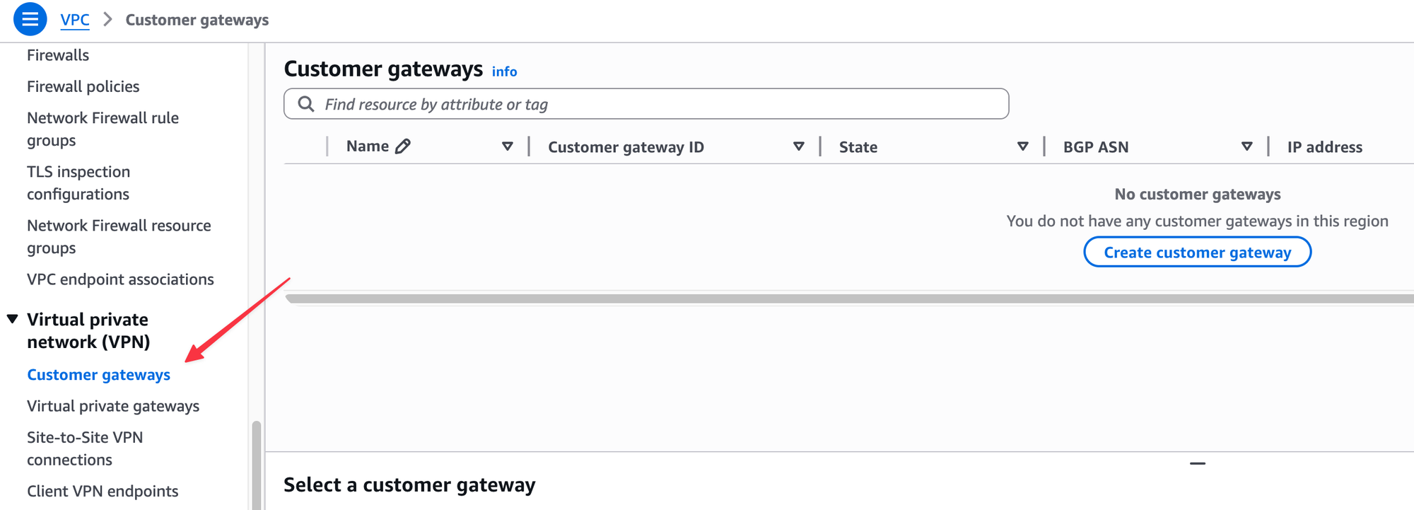 The first step is to create the Customer Gateway. To do this, navigate to the VPC service console and select 'Customer Gateways' from the menu under 'Virtual Private Network (VPN)'.