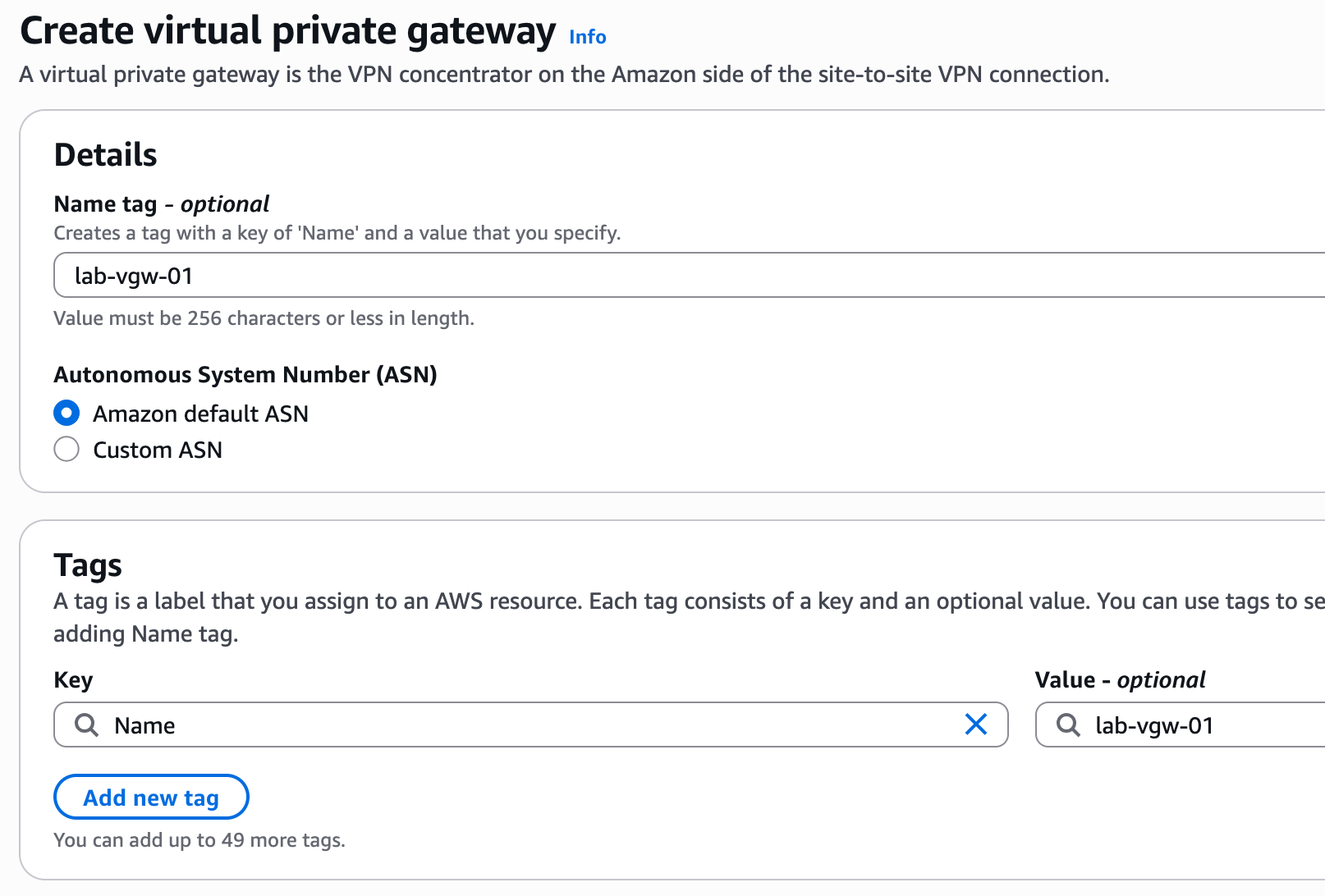 You only need to give it a name, like lab-vgw-01, and you can leave the 'Autonomous System Number (ASN)' set to the 'Amazon default ASN', which will assign a private ASN for you.