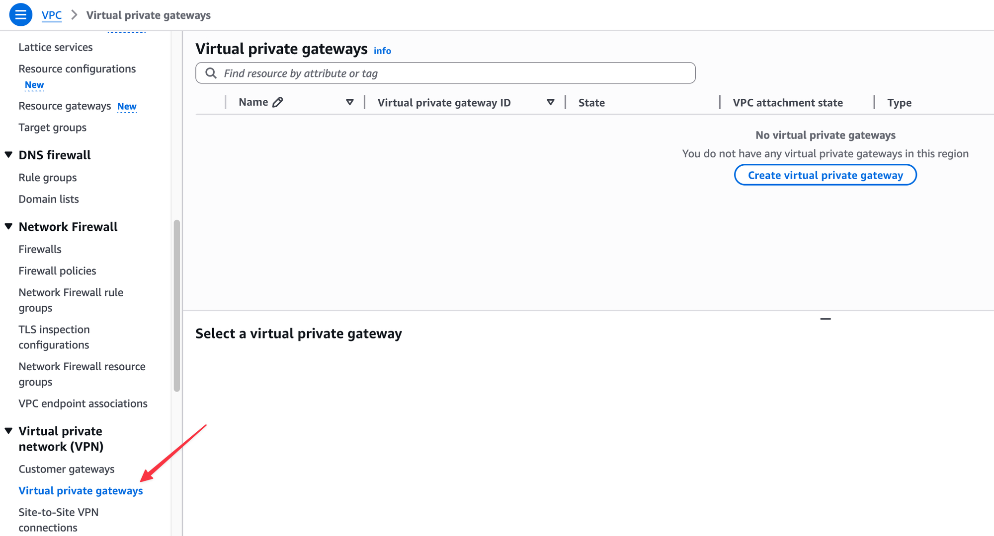 Similar to the Customer Gateway, the next step is to create the Virtual Private Gateway (VGW) on the AWS side. From the VPC console, navigate to 'Virtual Private Gateways' under the 'Virtual Private Network (VPN)' section and choose to create a new one.