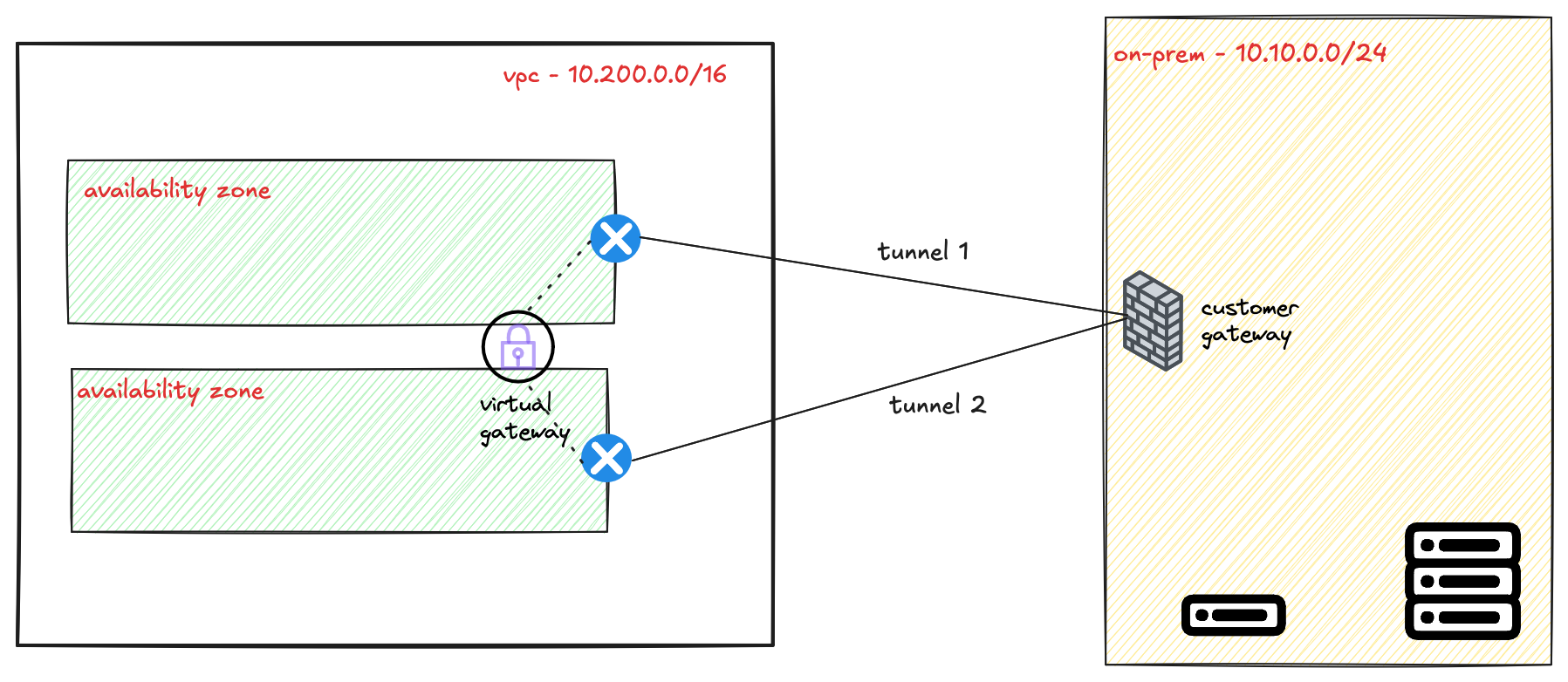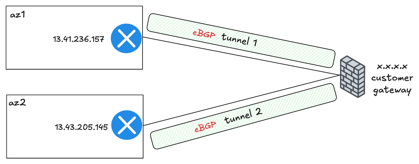 Each of these two tunnels terminates on a separate, redundant endpoint within the AWS network. These endpoints are located in different Availability Zones to protect against an issue affecting a single data centre. Your on-premise device should be configured to connect to both of these tunnel endpoints to take full advantage of this fault-tolerant design.
