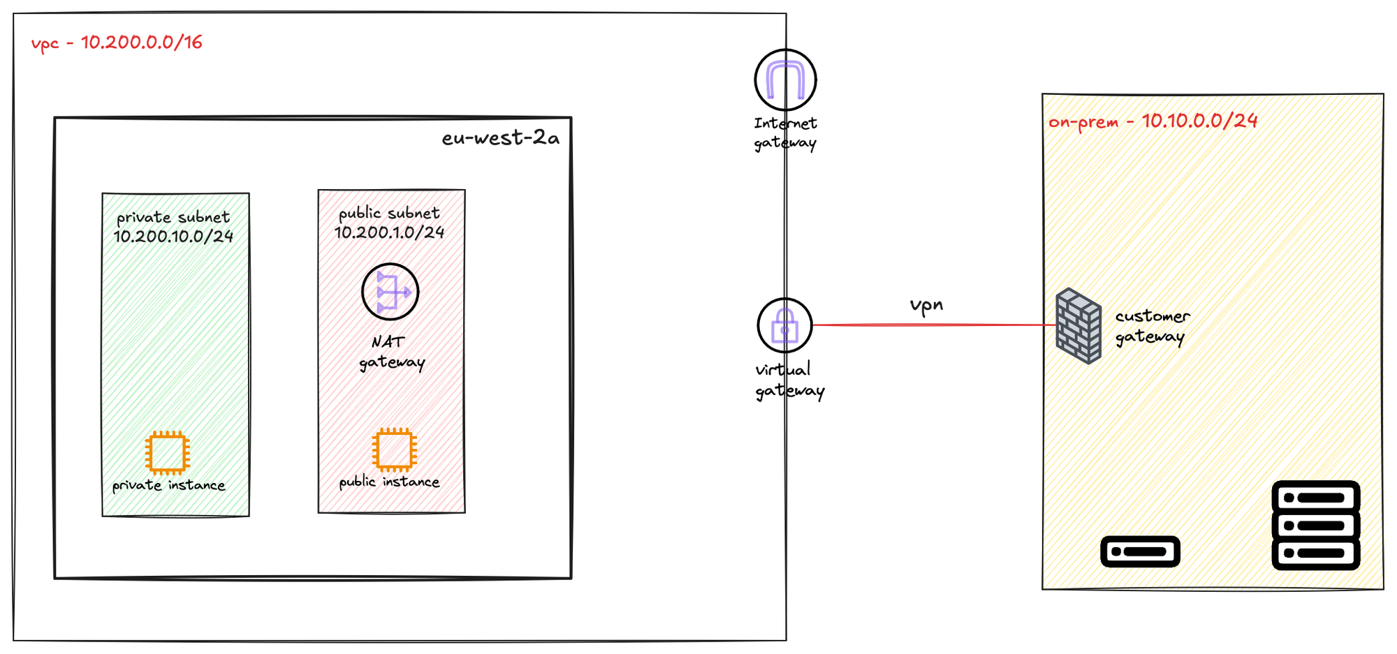 On the AWS side of the connection, we need a different type of gateway. You will remember that we routed Internet traffic to an Internet Gateway or NAT Gateway. To send traffic from your VPC to your on-premise network, you route it to a Virtual Private Gateway (VGW). The VGW is a logical, redundant resource on the AWS side of the connection that you attach to your VPC. It serves as the target in your route tables for any traffic destined for your on-premise network.