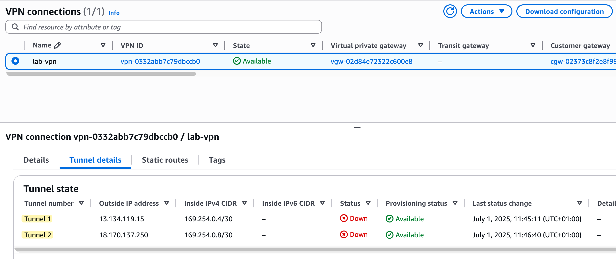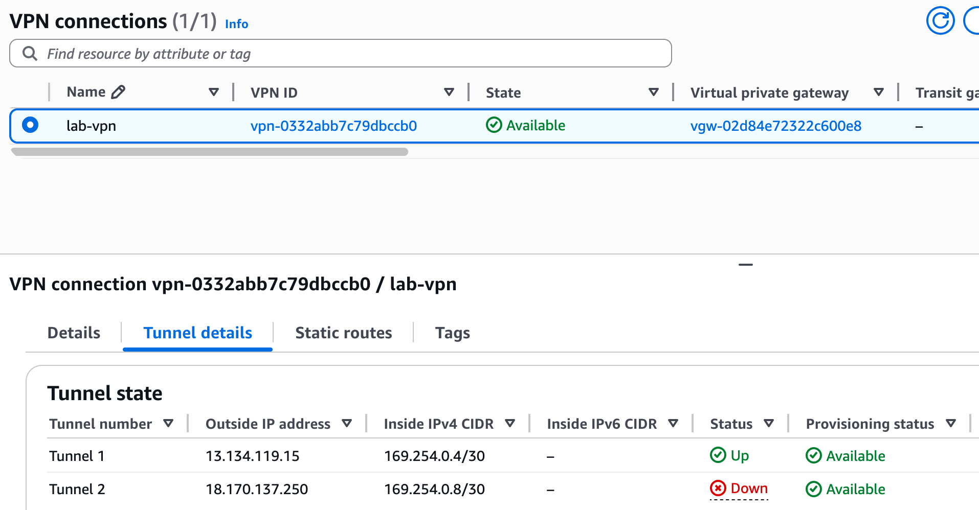 After you create the connection, the state will change to 'Available', but if you look at the 'Tunnel details' tab, you will notice the status for both tunnels is 'Down'. This is normal and expected because we have only configured the AWS side of the connection. Here you will also see the two public IP addresses to which we will establish the VPN.
