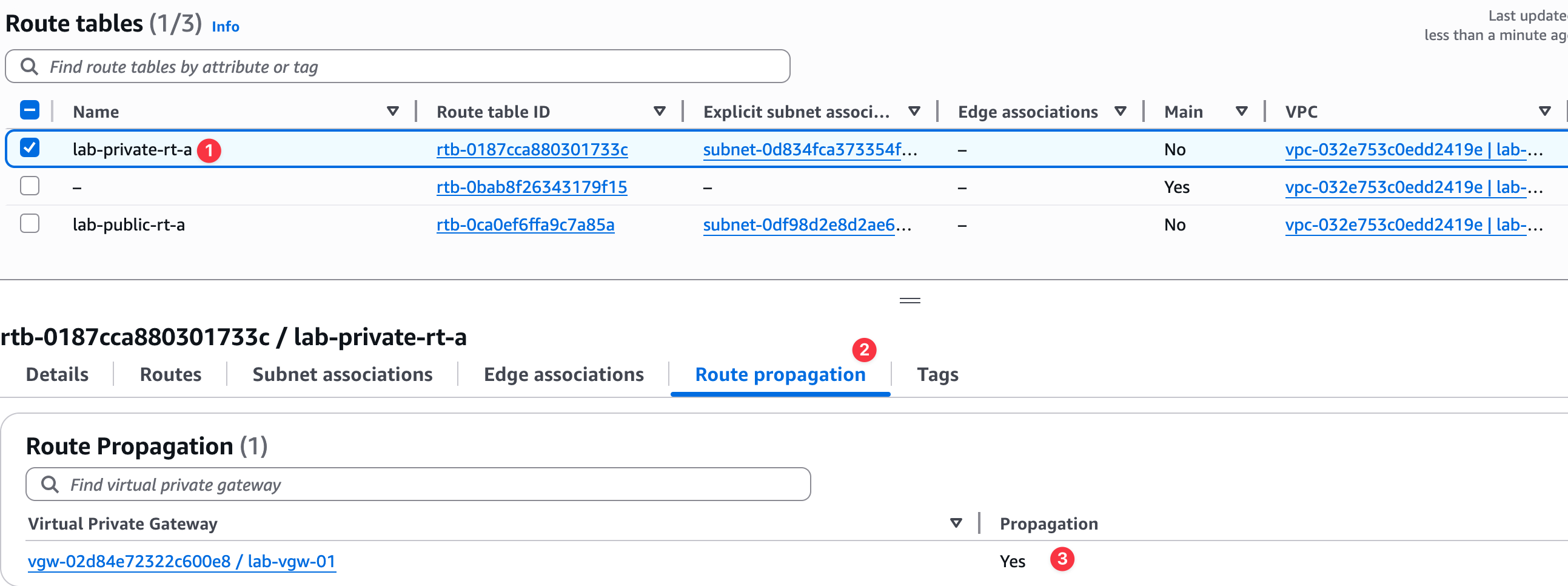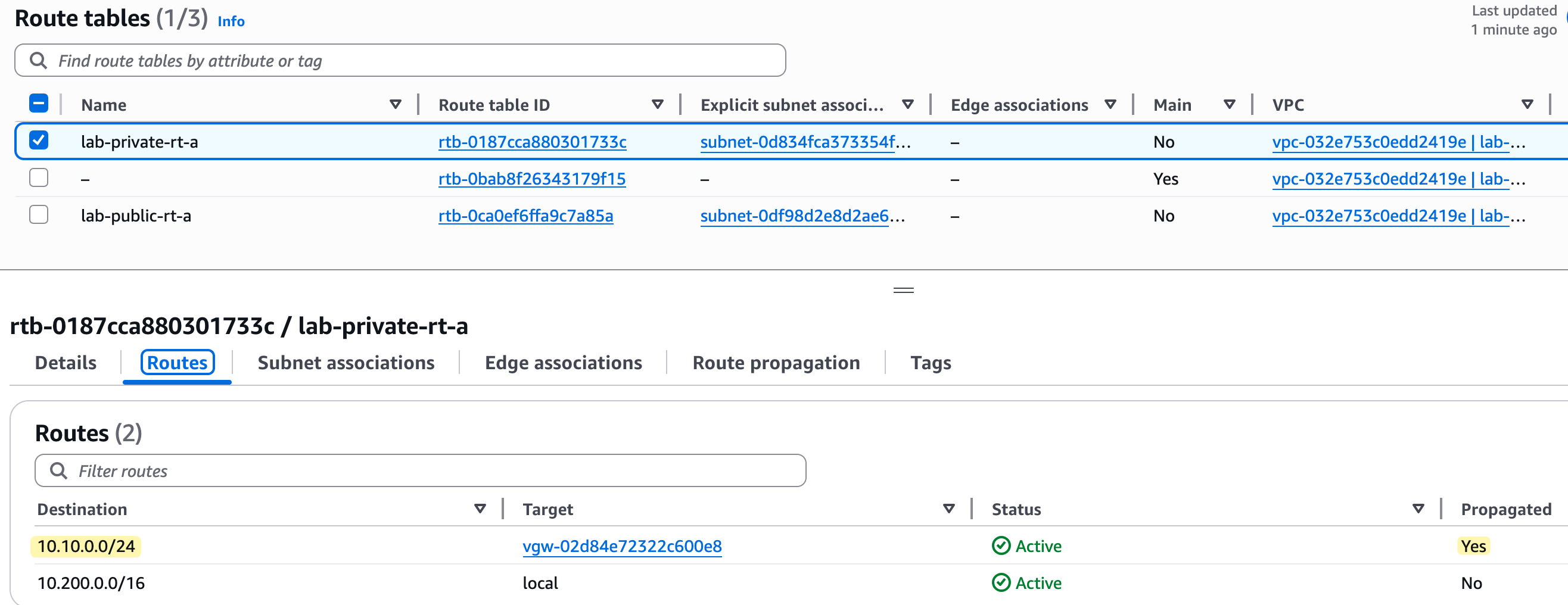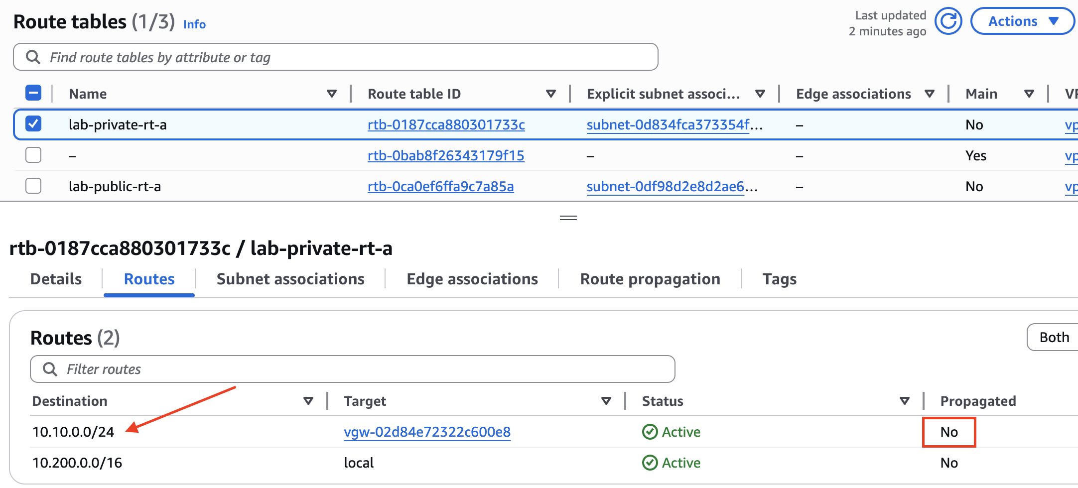 To show you how this works, I have removed the static route (10.10.0.0/24) that we just added to the lab-private-rt-a route table.