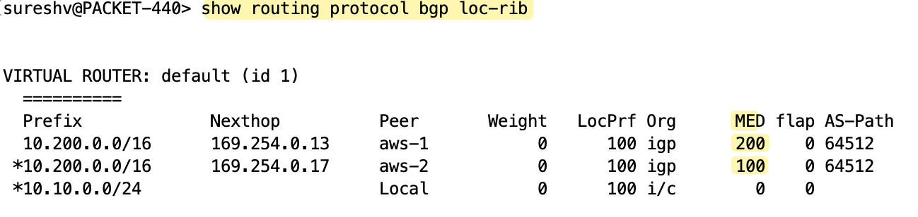 If you look at the received routes from AWS on the customer gateway (Palo Alto in this example), you’ll notice that the second tunnel has a MED value of 100 and the first tunnel has 200. So, for outbound traffic, the firewall prefers the second tunnel (tunnel.22) with the lowest metric.