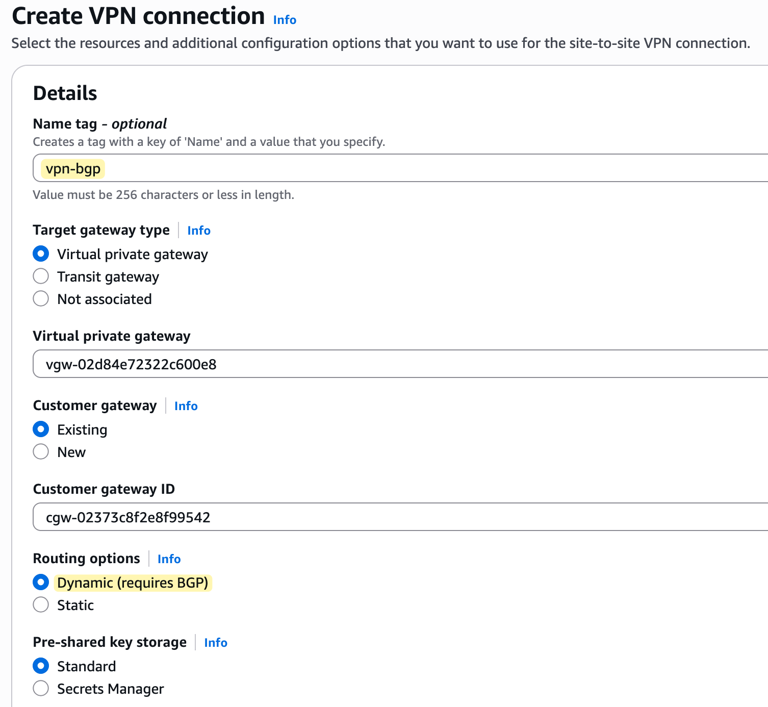 When you set up a Site-to-Site VPN, you have to choose between static and BGP routing. The choice between static and dynamic (BGP) routing primarily affects how your VPN connection handles failover and maintenance.