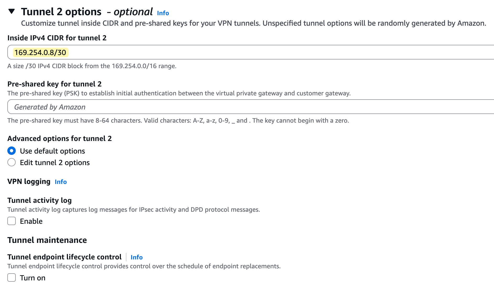 These IPs must come from the 169.254.0.0/16 address range, with each tunnel needing a /30 CIDR block for its point-to-point connection. You can either enter these manually or leave them blank for AWS to generate them for you.