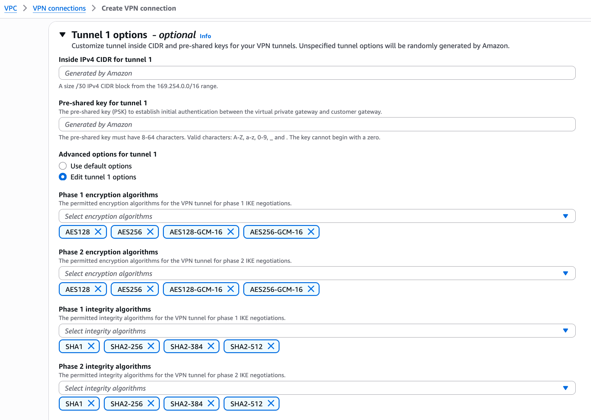 For tunnel options, we kept things simple and used the default settings. But AWS does let us customize these parameters if we need more control over the VPN configuration. As shown in the screenshot, we can edit the tunnel options and define specific encryption and integrity algorithms for both Phase 1 and Phase 2 of IKE negotiations.