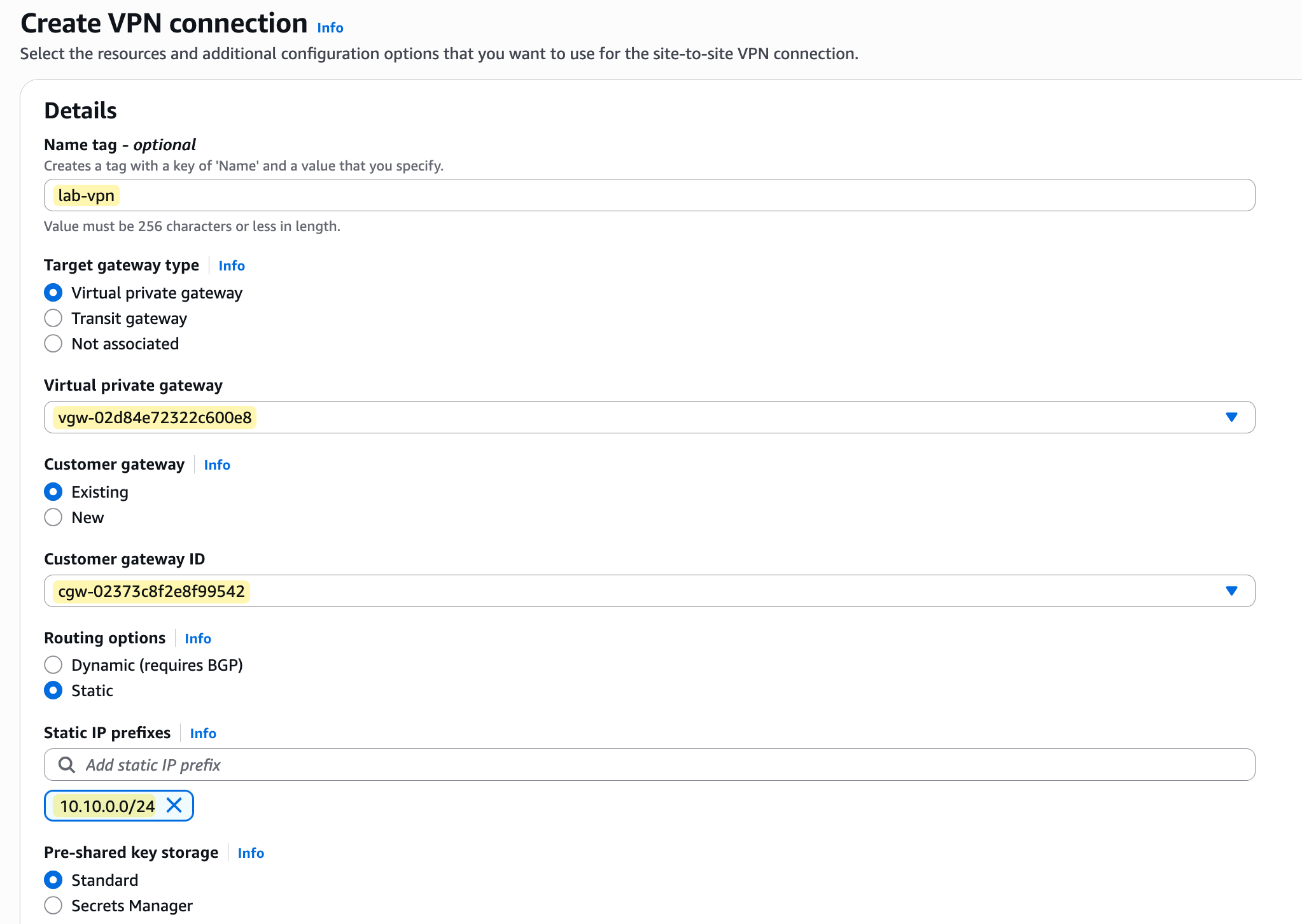 You might wonder how AWS knew which route to add. It's because when we configured the static VPN connection, we specified 10.10.0.0/24 as our on-premise IP prefix. Therefore, you can either keep propagation disabled and add the static route manually or enable propagation and let AWS manage the route for you.