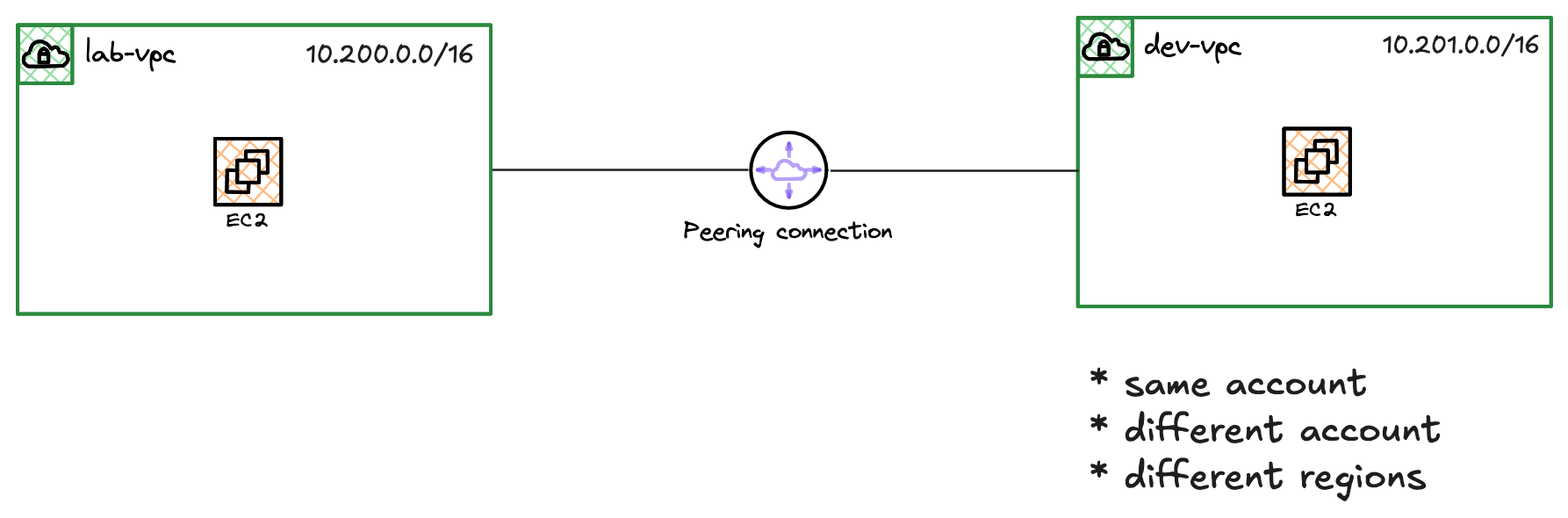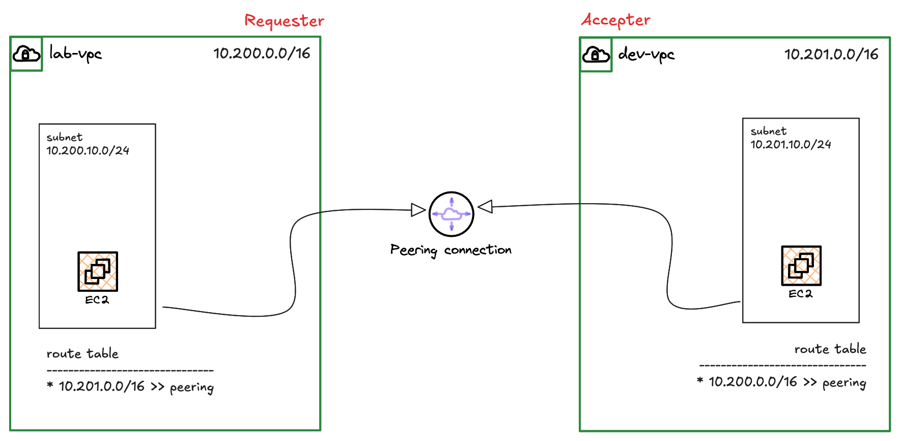 In this scenario, we have two VPCs - lab-vpc with the CIDR 10.200.0.0/16 and dev-vpc with the CIDR 10.201.0.0/16. As shown in the diagram, each VPC has one subnet and one EC2 instance. Our goal is to enable the two EC2 instances to communicate with each other using their private IP addresses.