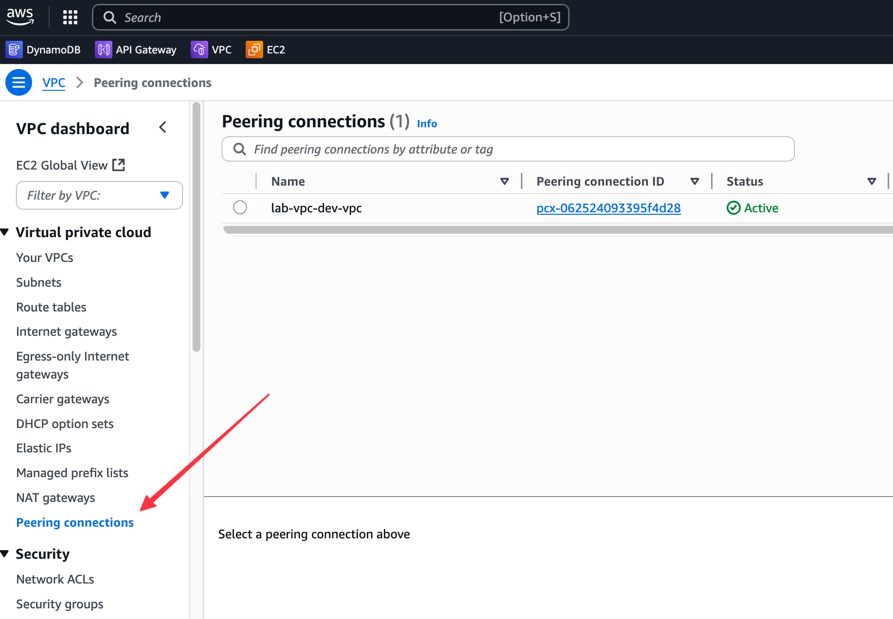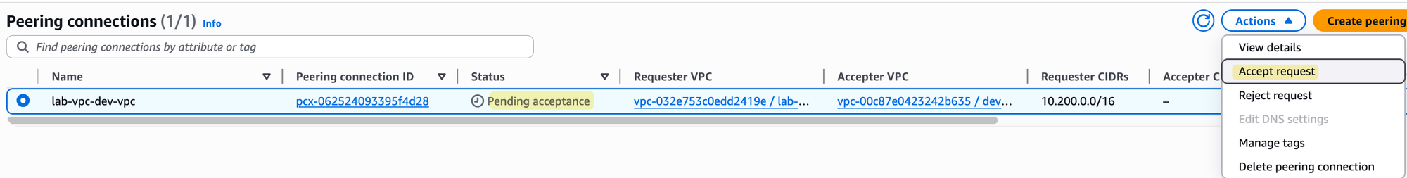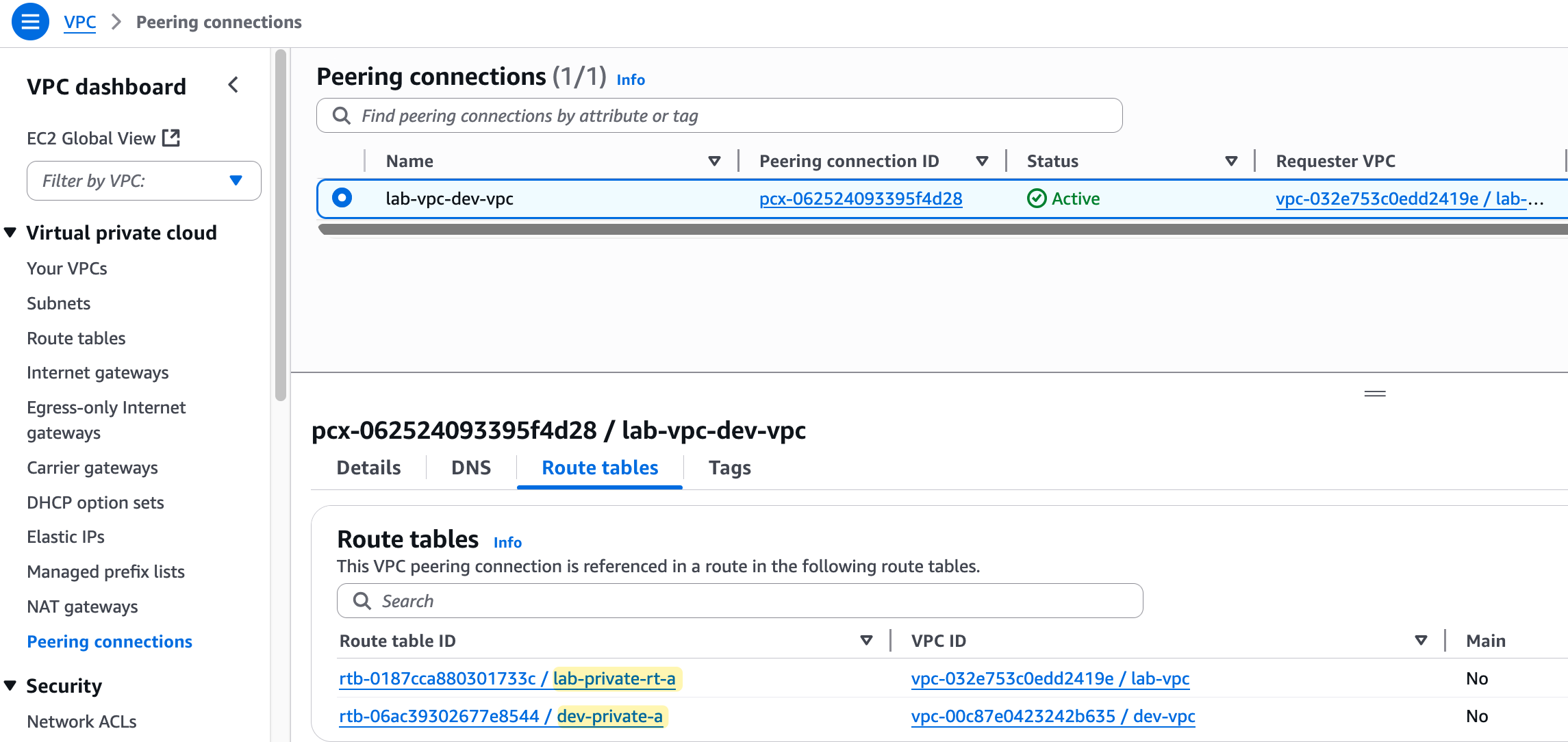 You can also go to the 'Route tables' tab for the peering connection itself to see in which route tables this specific peering connection is referenced. In our case, as shown in the image, this connection is correctly referenced in two places - the route table for the lab-vpc and the route table for the dev-vpc.