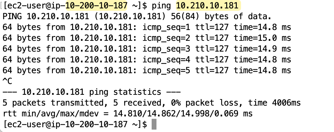 To test the setup, I connected to the instance in the lab-vpc (with the IP address 10.200.10.187) and from there, I tried to ping the private IP of the instance in the dev-vpc (10.201.10.160).