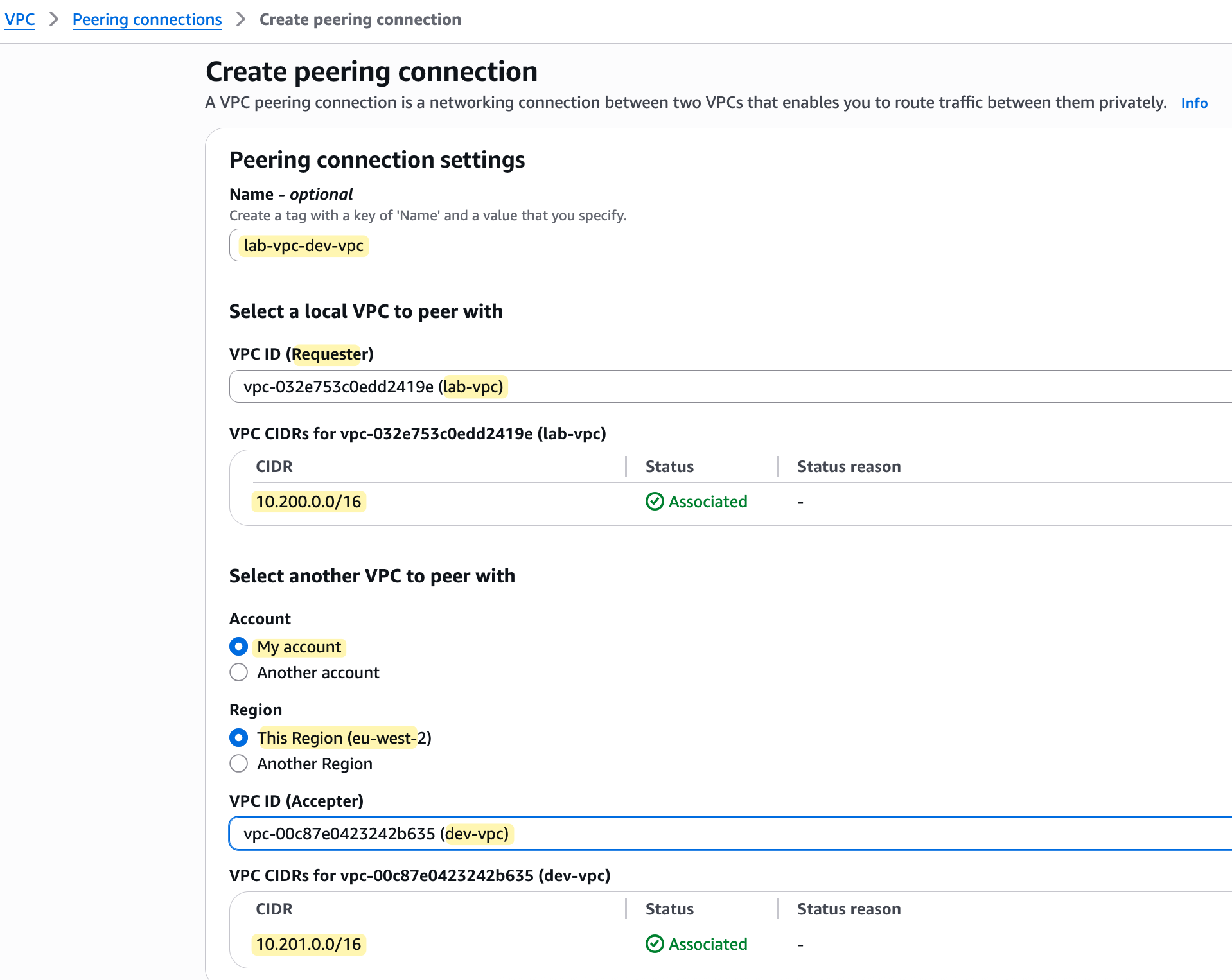 Next, let's look at creating a VPC peering connection between two different AWS accounts located in different Regions. For this example, my primary account with the lab-vpc (10.200.0.0/16) is in the London Region. I am going to peer this with a new VPC (10.210.0.0/16) that I have created in a second AWS account located in the Frankfurt Region.