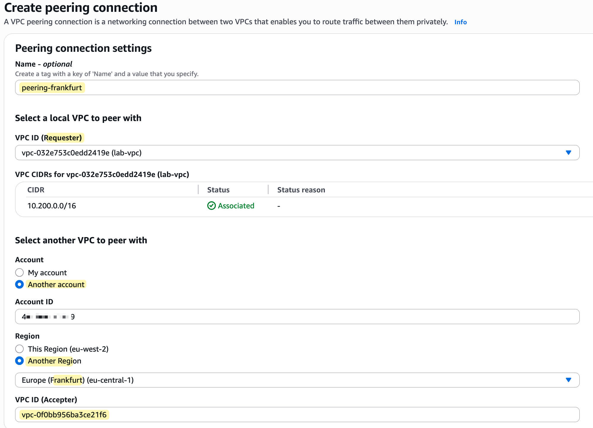 The process starts similarly; you create a VPC peering request from the primary account. However, in the creation wizard, you must specify that the accepter VPC is in 'another account' and select the correct destination Region (Frankfurt). You will then need to provide the AWS Account ID of the second account and the VPC ID of the VPC you want to peer with.